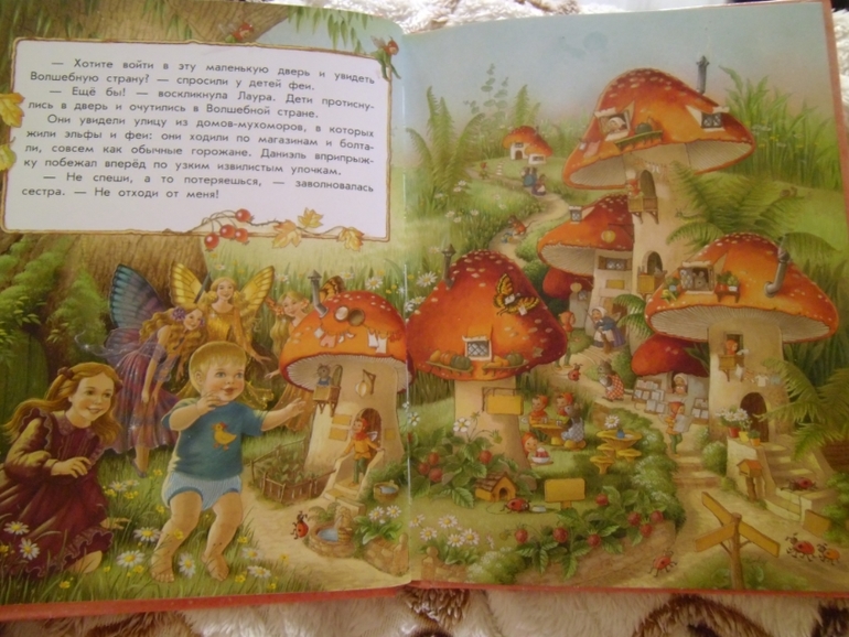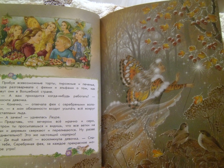 Третья книга из серии.Мне не понравилась.Красивые картинки,плотная меловка,но рассказ ниочем.Мальчик и девочка попали к феям,погостили у них и пошли домой.Читать откровенно скучно,слог тяжеловат и мне спать под эту книжку хочется.Спрятала ее.А дочке нравится,но читать не просит,щас вот взяла только картинки посмотреть.