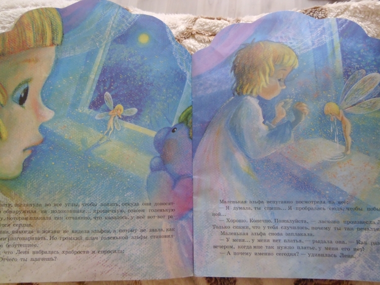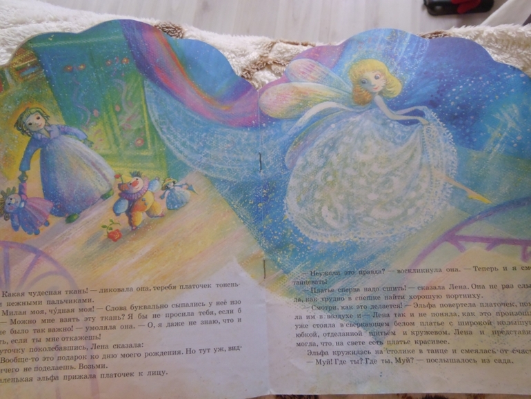 Эльфа и волшебный платочек.Купила недавно, 100% попадание-эльфы и красивое платье в одной книге- вызвали восторг.Тоже очень красивые иллюстрации,на первое чтение не подойдёт,шрифт на цветном фоне,немного рябит в глазах.