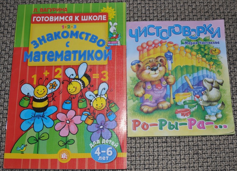 Две тоненькие книжечки. Знакомство с математикой была выбрана в подарок от Лабиринта для средней, но мелкая ее экспроприировала и теперь с ней не расстается - сравниваем по размеру, что-то там все рассказывает; то меня спрашивает, что там. Считаем цветочки, чайники и прочее.))))