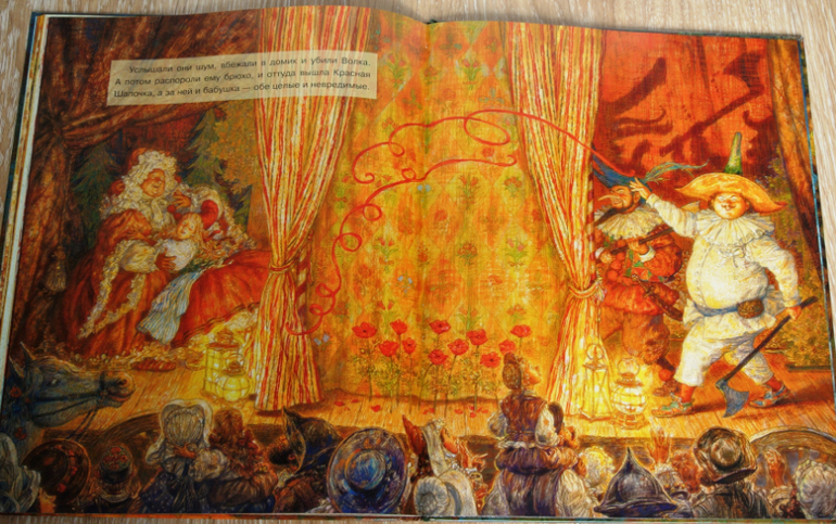 Художник предлагает нам посмотреть представление бродячего цирка. Где все герои сказки - актеры. Вот кибитка заезжает в город, вот бабушка зазывает публику, а Красная шапочка показывает акробатические номера...