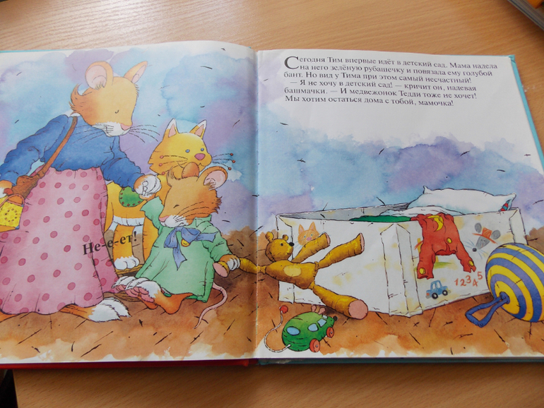 "Мышонок Тим не хочет идти в детский сад", нежно любима уже третьим моим ребенком, текст простой, милые иллюстрации, Милена даже цитировала мне некторые моменты одно время, а еще иногда просит читать "мышонок Милена" и поправляет меня, если я забудусь