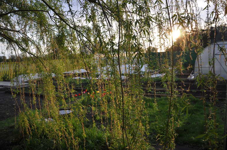 И пусть вчера 9 мая не удалось отметить на даче, начался дождь, но потом. Вы посмотрите, какая красота. Вся ива в маленьких искорках от дождя и закатного солнца. Вот он мой рай. Здесь. Под ивой.