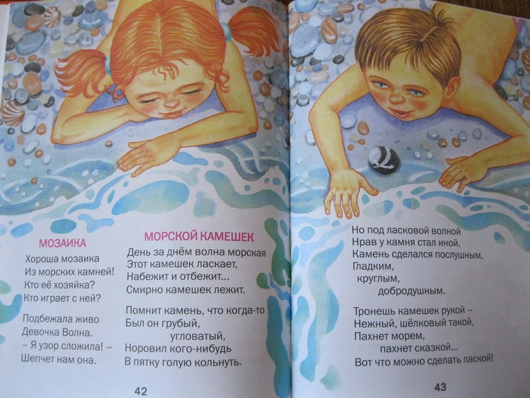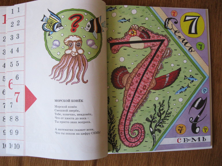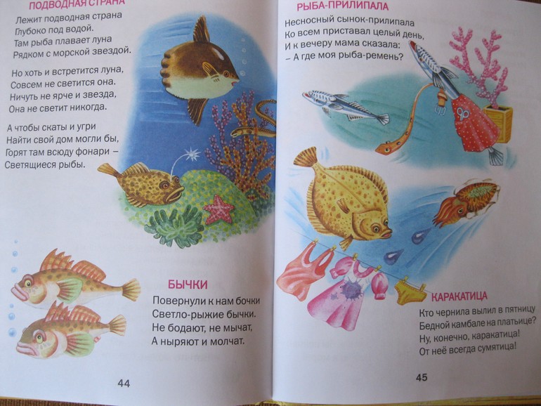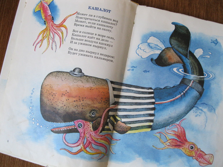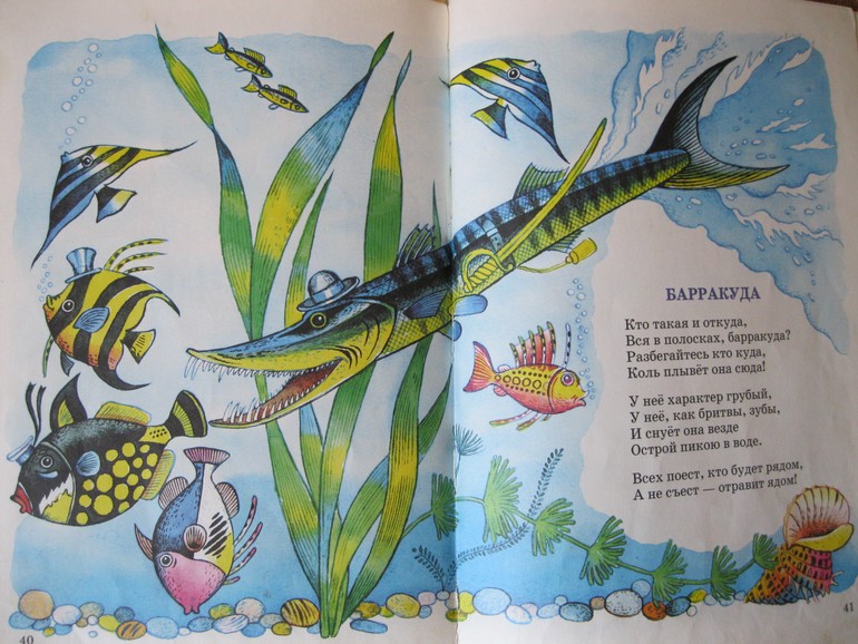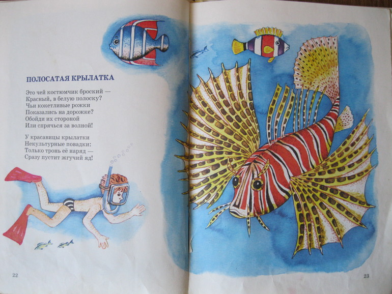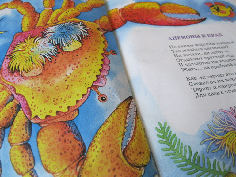 Вторая книга - со стихами про морских обитателей. Стихи неплохие, но меня не зацепили. Косте понравилось, многие перечитывались десятки раз. Ребенок просыпался и требовал "Кто живет в глубинах вод", засыпал только после прочтения "Кто живет в глубинах вод")