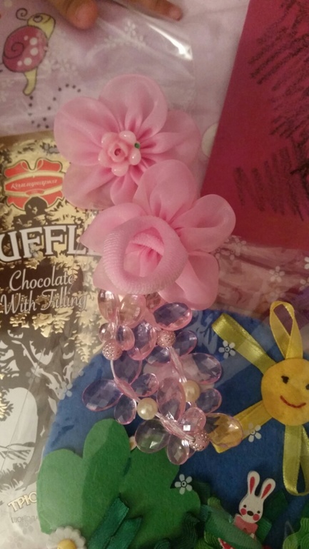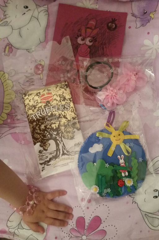 Браслетик -чудо! Поделитесь, где Вы такие чудесные бусины приобретаете?;) Евочке он ну очень приглянулся)) Резиночки Ваши носим чуть ли не каждый день), открытка просто изумительная, очень креативная, и с душой, - мы так рисовать еще не умеем) очень любопытно, кто автор рисунка;) панно Ева тут же пристроила на стену) а шоколад, ммм, как раз для мамы)) Каждый подарочек празднично упакован! Спасибочки!