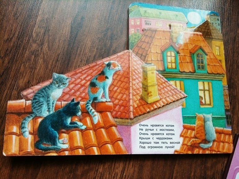 Кошки у нас пока " коки". "Где живут коты". Читаем пока по одной-две странице и там, где откроем. Иногда сама может: та-та-та та-та-та-та.