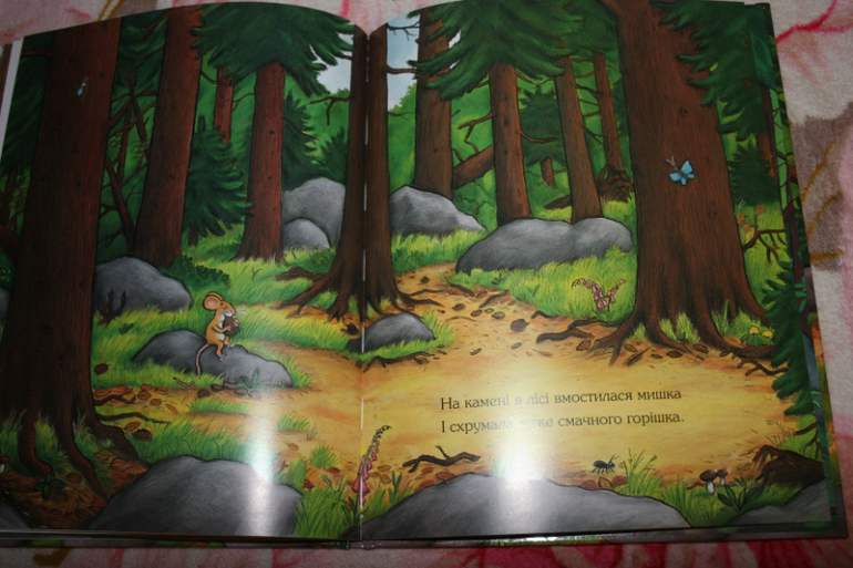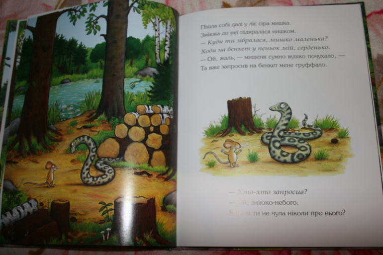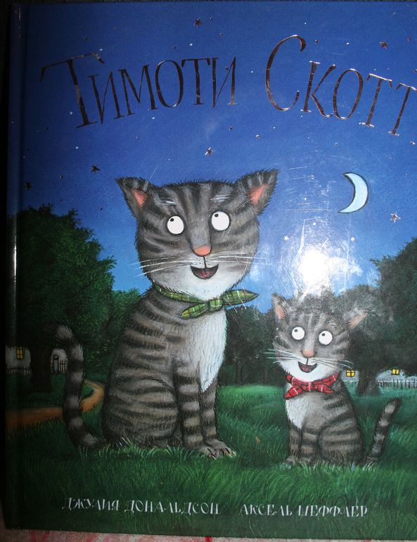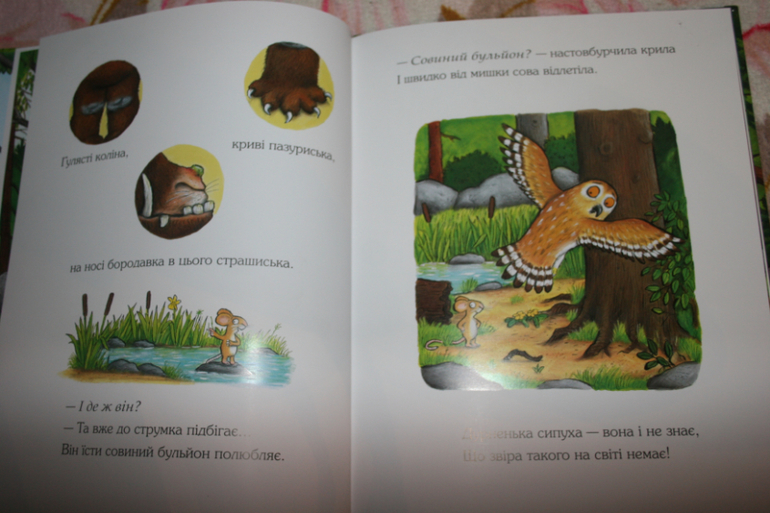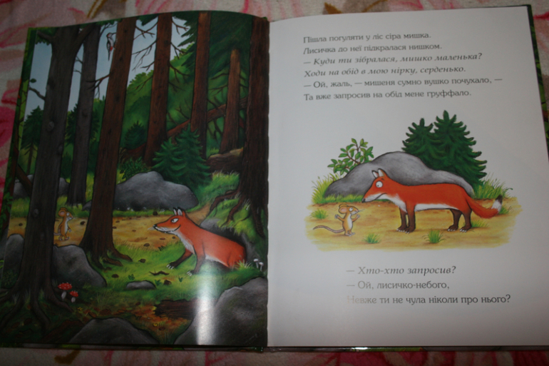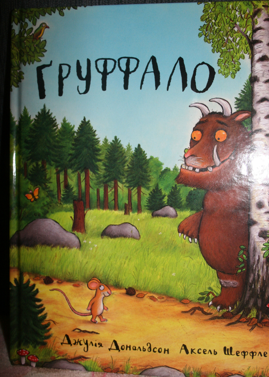"Скотта" нам совсем недавно подарили. Слышала, что для многих она скучна. Что ж, всякое бывает, верю. Мои любители кошек ее полюбили сразу. Особенно старший, напевает песенку про Муррразлучных друзей. Весьма трогательная история. "Груффало" - классная, смешная, яркая. Наверное, мы одни из последних, у кого она появилась. У нас она на украинском. И на данный момент это любимейшая книжка у младшего, просто фурор.