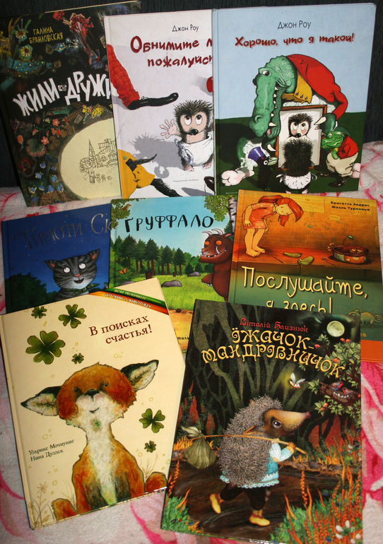 Когда плохая погода, или серое небо, или что-то не так, или просто взгрустнулось, книги из этой стопки нас обязательно порадуют и подымут настроение. Они собрались по размеру и совместимости - все яркие, все подходят на наш возраст (2+ и 4+), в каждой - одно произведение (кроме "Жили-дружили", там сюжет разбит на рассказы) и, странное дело, никогда не надоедают. Н-р, книги про малыша-ежика мы читаем со страшим сыном полтора года. Да и Браиловскую столько же времени. Теперь дорос младший, и слушают-смотрят вдвоем.
