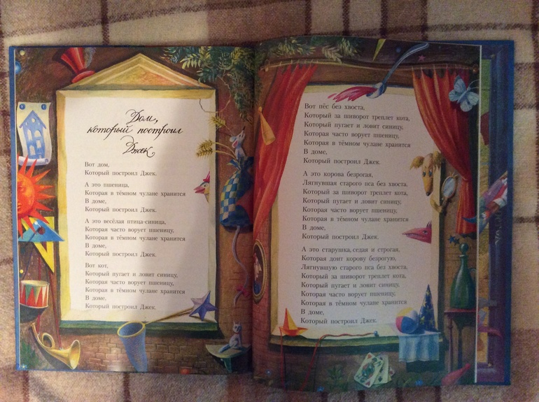 С этой книгой дочка, наконец до конца дослушала "Дом, который построил Джек". Это единственная песенка, которая постоянно "неть, другая". В песенке много повторений и моей егозе просто становится скучно, а тут столько всего интересного. Все такое живое с кучей деталей. Картинки с юмором и взрослым интересно.