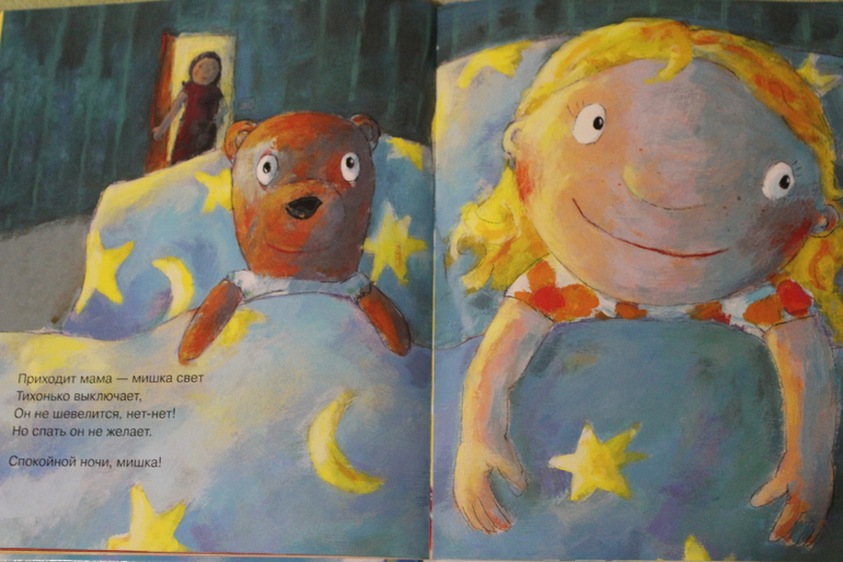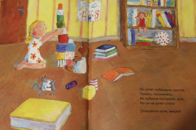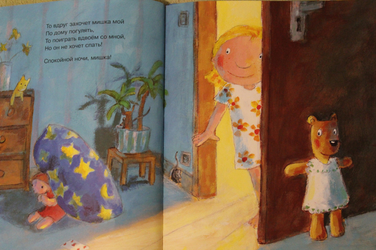 Я покупала эту книгу с мыслью, что это станет нашей сонной книжкой. Потому что Юля долгое время укладывалась ну почти что также как мишка из этой книги. То пописять, то поиграть, то покупаться и т.д. Но времена меняются. А книга по прежнему читается, но отчего-то не на сон, а с утра)))) Немного фото разворотов