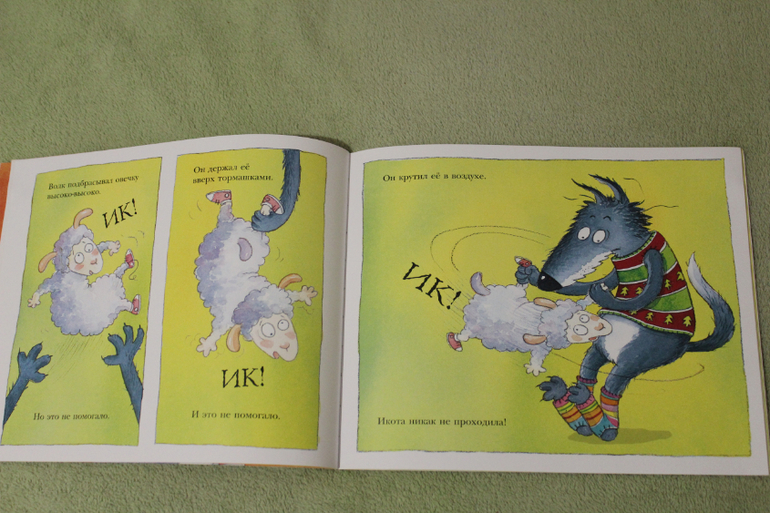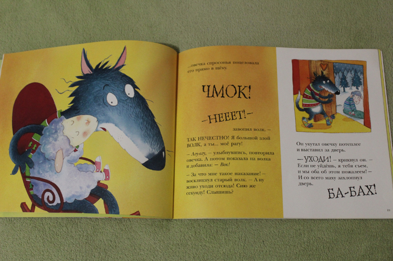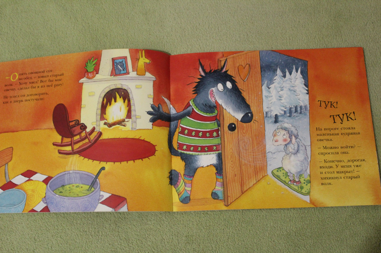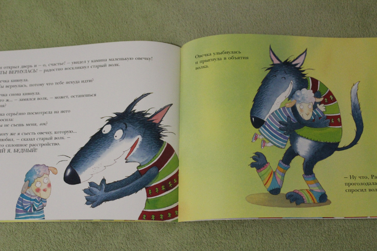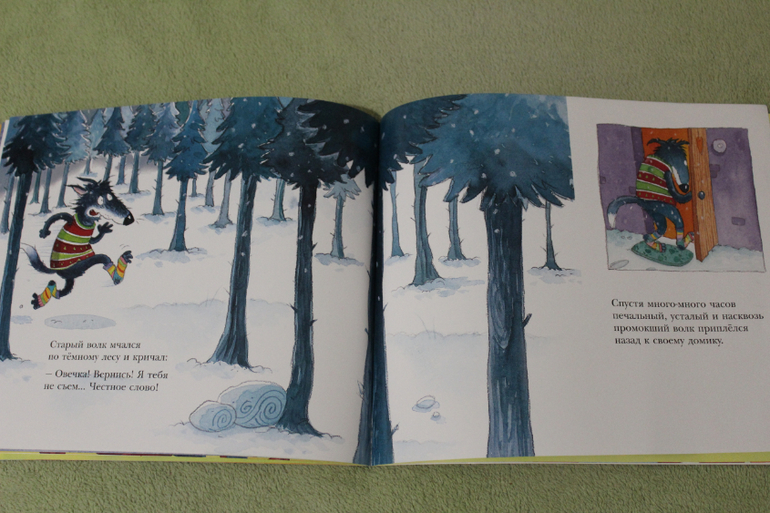Иллюстрации здесь, конечно, уже с фантазией. Но это и не беда, если ваши малыши уже ни раз на картинках видели как выглядит настоящий волк и овечка. Настала пора фантазировать. Что мне очень нравится в рисунках, так это то как передаются эмоции и действия. Ну очень живо и так прямо эмоционально. У меня прямо мультик сразу в голове рисуется. Ну вот, собственно, немного разворотов