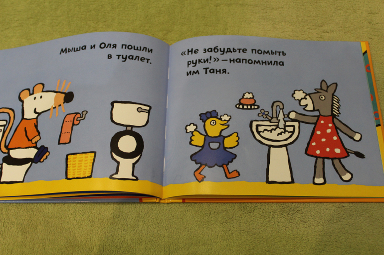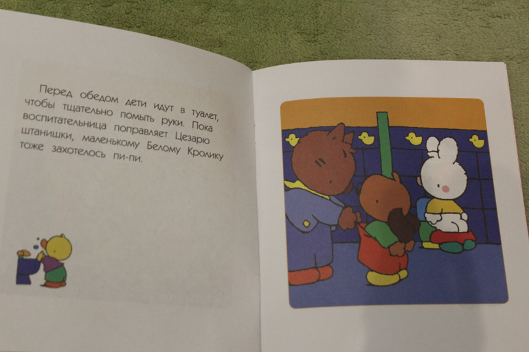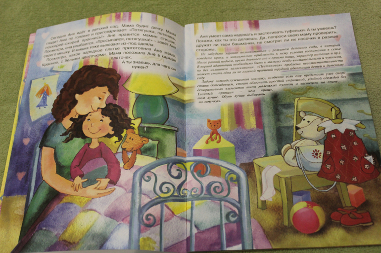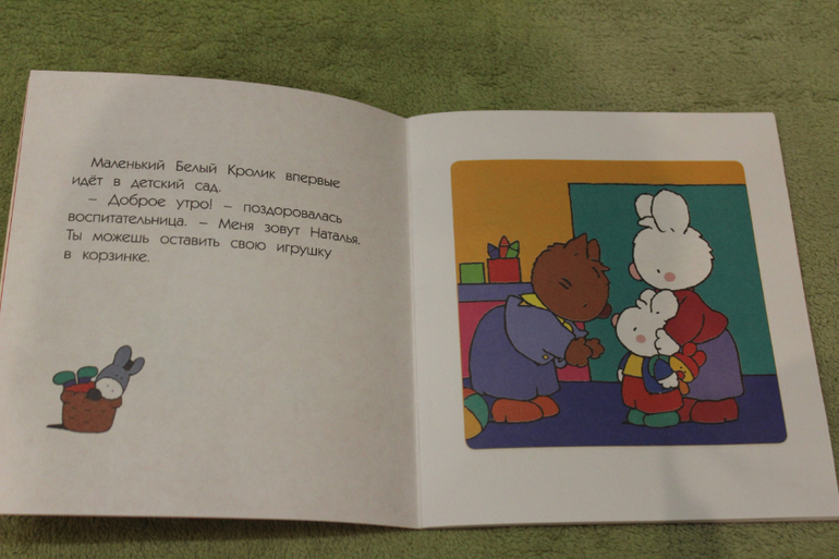 И на мой взгляд, из всех трех книг этот рассказ лучше всего знакомит малыша с тем, как все будет в реальности. Мама утром будит, отводит в детский сад и оставляет там, есть информация о режимных моментах в садике