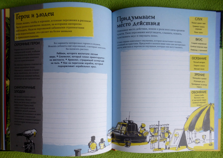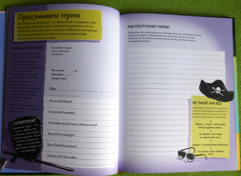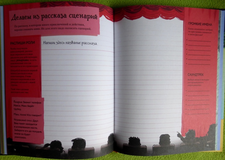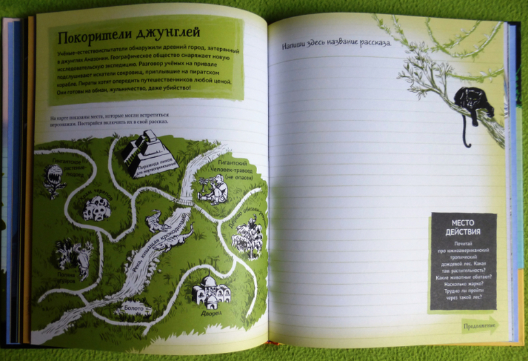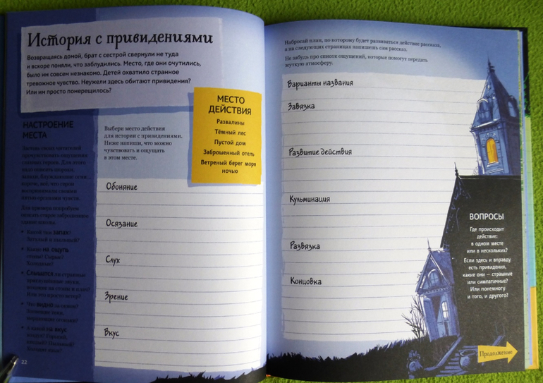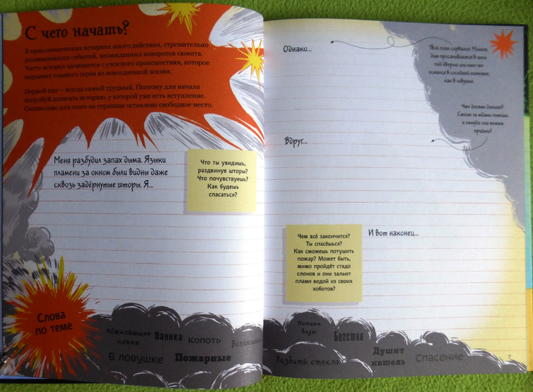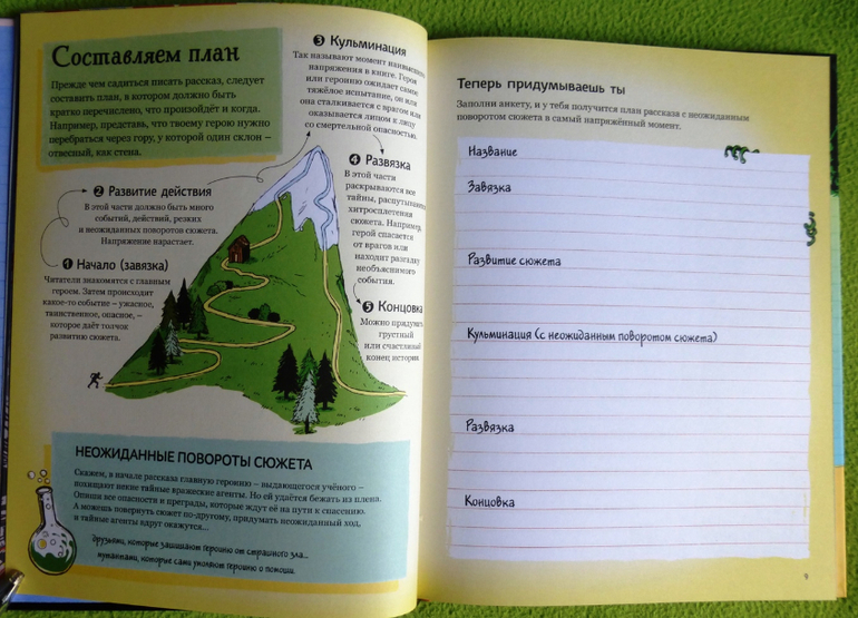 В этом творческом альбоме сразу совмещены теория и практика, на разворотах страниц можно сразу потренироваться и записать свои истории. Здесь есть «заготовки» сюжетов для истории с инопланетянами, путешествия во времени, ужастика с привидениями, триллера с участием акулы, шпионского детектива, леденящей кровь истории про заброшенную хижину в лесу и др.