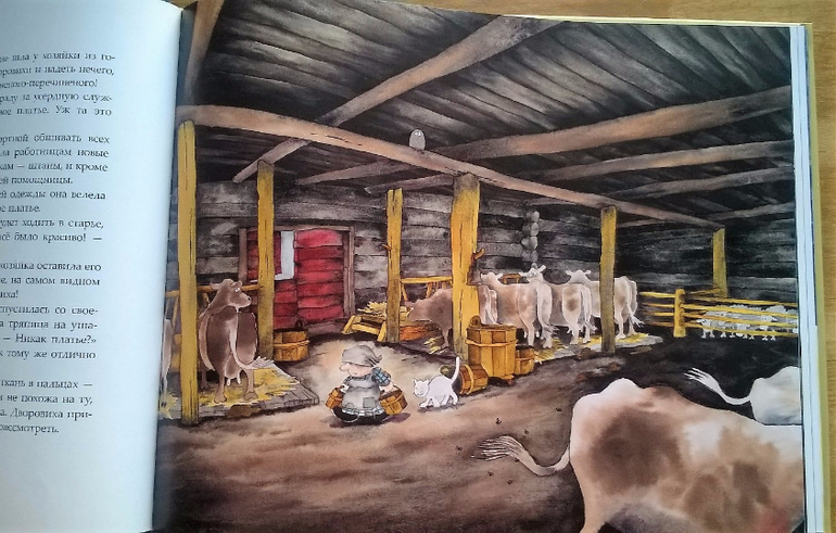 Книга формата примерно А4, 48 страниц, редкая ориентация - альбомная. Здесь нет единой истории, она состоит из маленьких рассказов-сказок, всего их 14, и каждая о своем домовом, а их, оказывается, тьма самых разных - и конюший, и баенник, и амбарник.