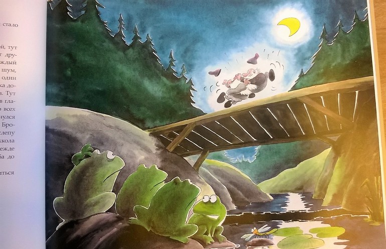 Текст написан с юмором даже, вот например, история про двух амбарников, которые преумножали богатство хозяев за счет соседей, таская по ночам муку, зерно и т.д.: "В одной усадьбе...Миккола жил очень хозяйственный амбарник. А рядом в другом селе стояла усадьба Кела, и там амбарник был такой же рачительный. ...Так что домовой из Миккола таскал к себе муку, а домовой из Кела - дрова." Однажды, возвращаясь с добычей, они и повстречались на мосту. Ну как глядя на эту картинку, можно забыть их фееричную встречу?))
