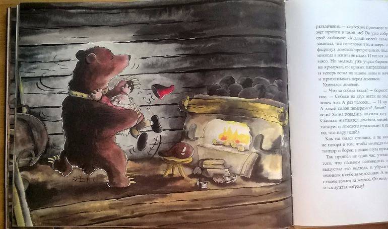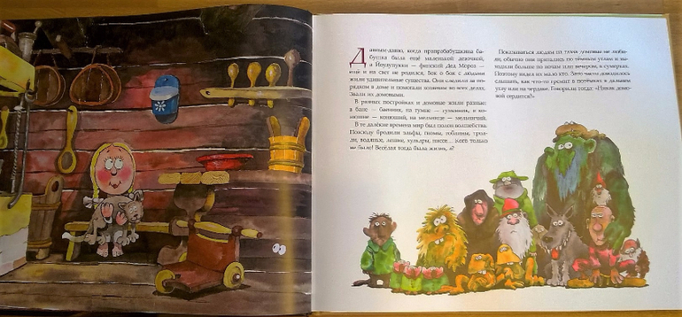 На каждого домового приходится минимум один разворот текст+картинка, иногда таких разворотов два. Полностраничная иллюстрация на каждом. Самое интересное в том, что картинка стопроцентно отражает суть истории! Я прочитала их залпом, и потом, когда пролистывала книгу второй раз, стоило мне увидеть картинку - я сразу вспоминала, о чем эта история. Так что ребенку будет просто ориентироваться в книге и выбирать историю, которую он хочет послушать. Вот несколько разворотов.