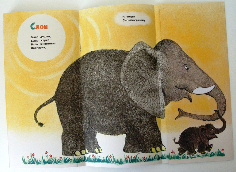 Сама по себе красочная книжка прячет в себе сюрпризы в виде раскрывающихся створок. А как дочка удивилась, когда створка раскрылась еще раз! На развороте с бегемотом от неожиданности так же рот открыла.