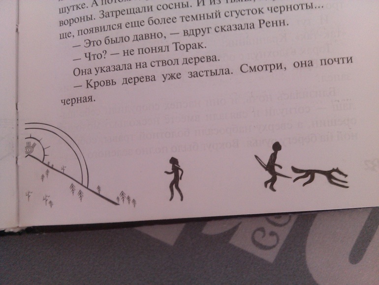 Это первая книга серии "Хроники тёмных времён".На каждой станице внизу "наскальные" рисунки, на протяжении всей книги складывающиеся в нарисованную историю. Только мне показалось что расположены они задом на перёд
