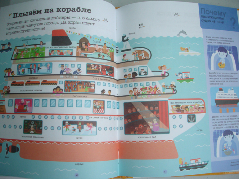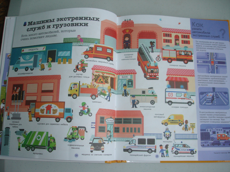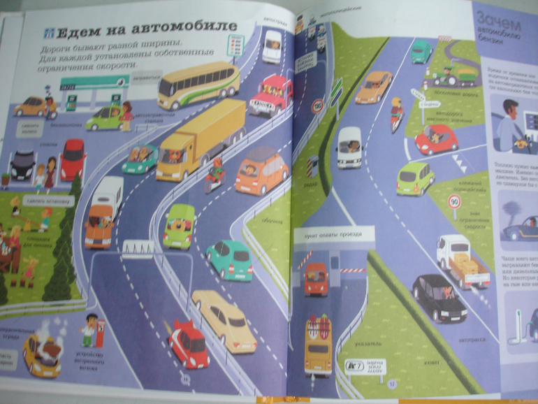Ещё на тему энциклопедий. «Транспорт» от «Оникса» из серии «Время моих почему» у нас давно, но интерес только проснулся. Для нас - палочка-выручалочка. Про транспорт интересно, но большинство книг - непонятно. А здесь же и поглядеть есть что и новые слова типа «автострада», «кемпинг» или «авторефрижератор» выучить. И текст на полях вполне годный для Саниного возраста. Например, объяснения про то, что проблесковые маячки - это мигалка, что каждая машина экстренных служб подаёт свои сигналы. Читаем практически только про наземный транспорт. Впрочем, Саню и в жизни интересуют только то, что ездит по земле. Замечено, что к выставочным самолётам и вертолётам он равнодушен. Про то, что "для младшего школьного возраста" - это они хватили лишку. Информация обрывочная и, скорее, ознакомительная. Для школьника мало. Развороты покажу: