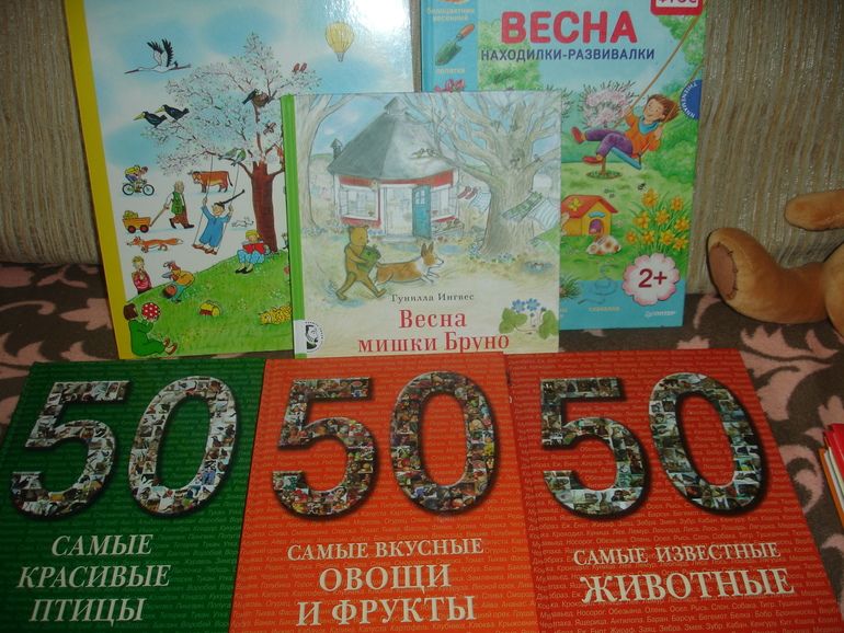 "Находилки-развивалки" почему-то идут слабенько. Думаю, покупать ли лето и осень. Бернер, наверное, не буду. Цена у неё всё ползёт вверх, а вот типографию я предпочитаю немецкую. "Зимнюю книгу" пришлось клеить, треснули швы достаточно быстро. Весенняя - ещё немецкая. Так вот эти книги и по толщине картона отличаются и по цветопередаче. Может, если бы не с чем было сравнивать, не заметила бы.