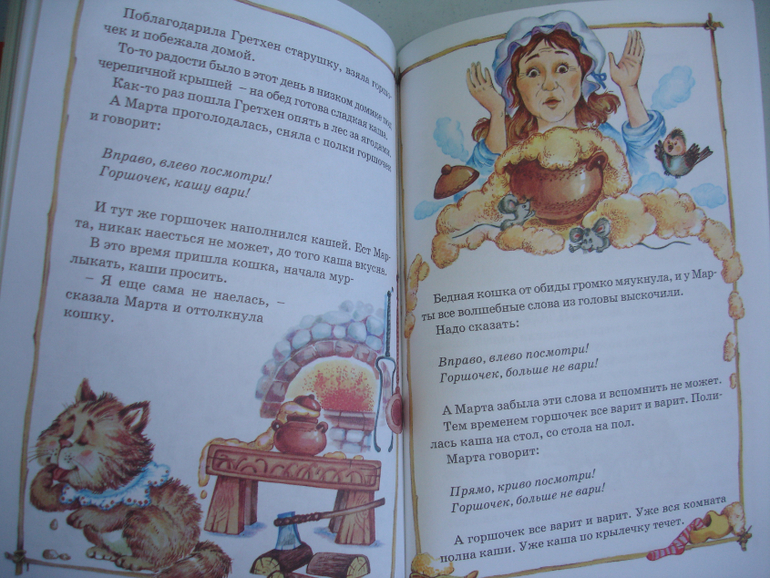 «Горшочек каши» в пересказе С.Прокофьевой тоже нравится. Здесь целый экшн, как мама вспоминала «пароль» от горшка. Надо было сказать: «вправо, влево посмотри, горшочек, больше не вари», а она что только не говорила: и «прямо, криво посмотри» и «вниз, вверх посмотри».