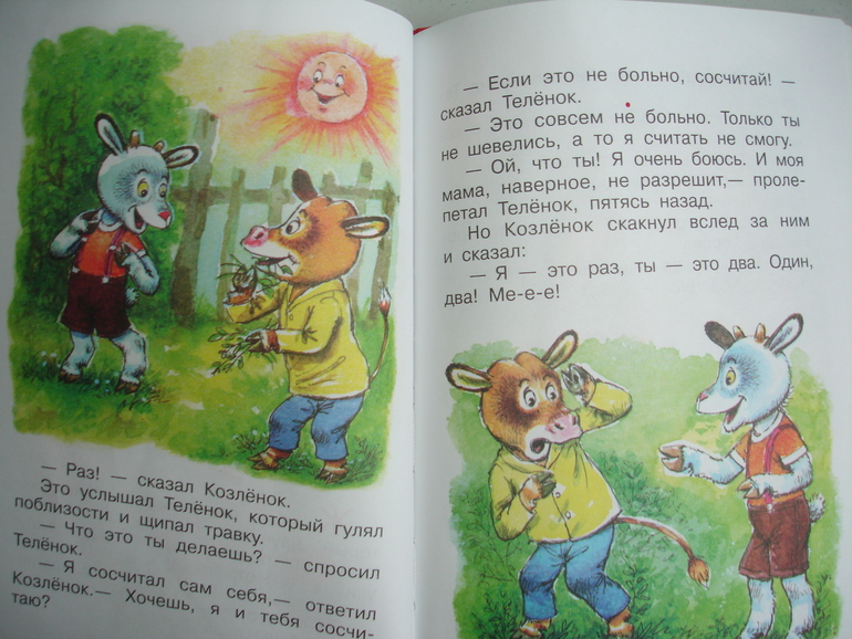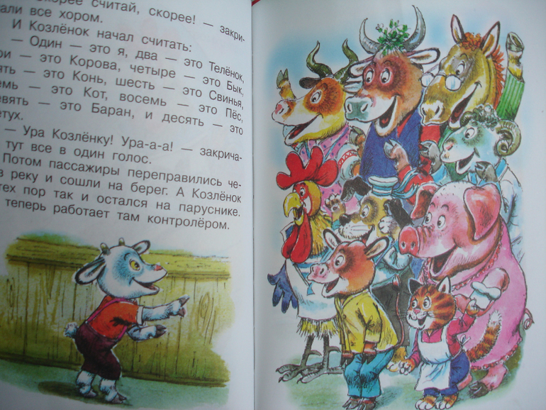 А.Прёйсн - «Про козлёнка, который умел считать до десяти». Книга рассчитана на самостоятельное чтение. Здесь две истории. Про Крошку Енота и Козлёнка. Крошка Енот оказался слишком длинным, Саня к середине потерял интерес. Всё-таки более короткая версия без этих повторов «возьми палку, возьми камень» Сане пока больше по возрасту. А вот «Козлёнок» в иллюстрациях Савченко имел большой успех. Вообще-то Саня и так считал бойко до 10, но я благодарна этой книге за то, что она «развязала» Сане язык и он произнёс самую длинную речь в своей жизни: «Один - это я, два - это телёнок, три - это корова, четыре - это бык, пять - это конь». Особенно приятно соотношение текста и иллюстраций - ничего не обгоняет, всё по делу.