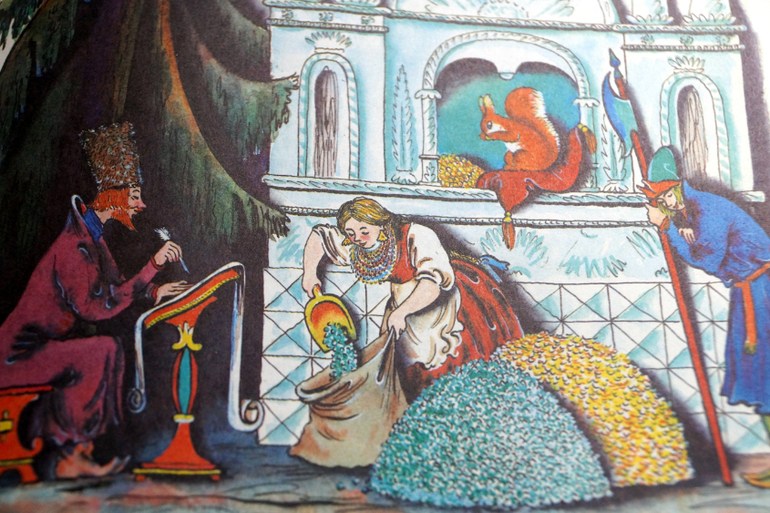 Кстати племянник мой недавно отдал несколько книжек, среди них сказки Пушкина, илл-Конашевич. Вот удача!Мы её тоже читаем, но Дехтерёв все -таки нравиться больше, может потому что мы к нему уже привыкли.
