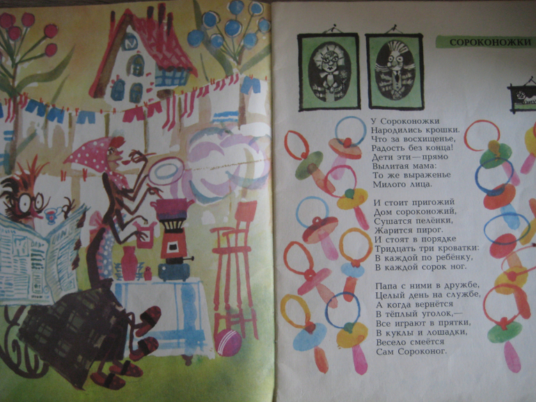 Столько всего яркого-красивого! И, главное, незнакомого (это я про сохранившиеся). Про некоторые я даже не слышала. У меня разве что точно такой же "Айболит" есть. Квитко мне понравился, Пивоварова. И сороконожки, конечно, харизматичные, ничего не скажешь.