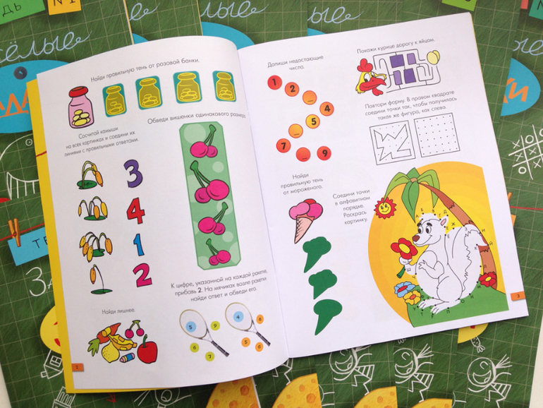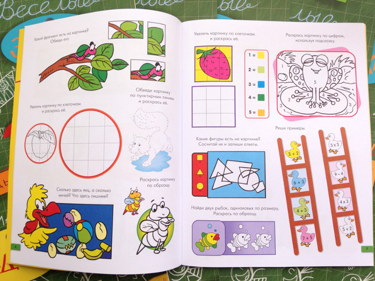 Вот примеры заданий: увеличить картинку по клеточкам и раскрасить ее, найти недостающий фрагмент картинки, разгадать кроссворд, соединить точки по порядку и получить рисунок, провести героя по лабиринту, пронумеровать картинки, чтобы получился связный рассказ, найти правильную тень, сосчитать предметы, найти спрятанные цифры, найти 10 отличий и многое, многое другое.