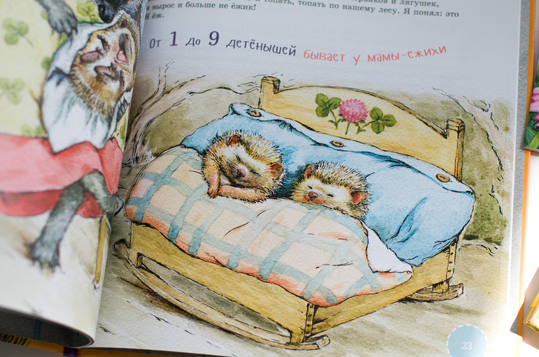 Повествование идет от лица маленького ежонка. Он просто рассказывает о том, что кушает, чему его учит мама, кого стоит бояться и так далее. Ежики - моя слабость, а тут еще такое достойное исполнение. Больше книг этой серии брать не планирую.