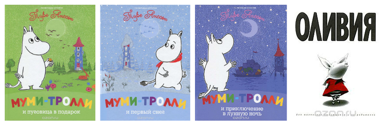 "Муми-тролли и пуговица в подарок", "Муми-тролли и приключение в лунную ночь", "Муми-тролли и первый снег" (изд.Махаон, пер. И.Цибизова)