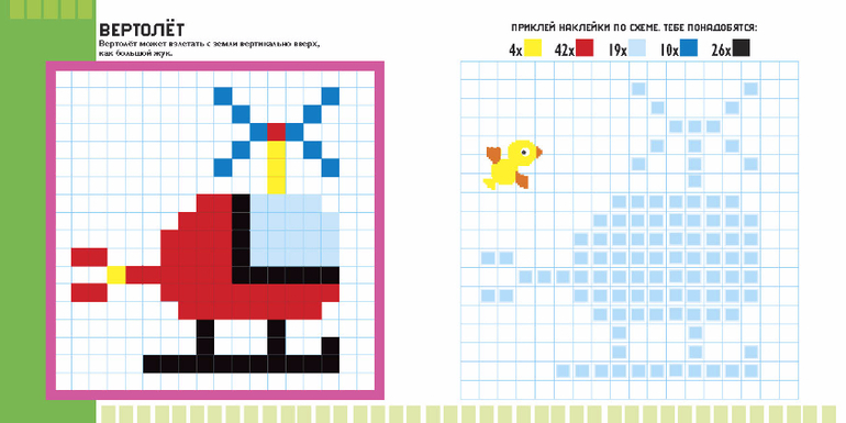 Для того чтобы дети тоже смогли освоить этот художественный стиль, издательство «Хоббитека» выпустило серию интерактивных детских книг Пиксели. Раскраски» и «Пиксели. Наклей и раскрась».