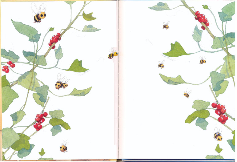 8. Нежно прорисованные пчелки и гроздья ягод и листочков у Квентина Гребана в книге Изабель Макой "Пчелка Мелли"