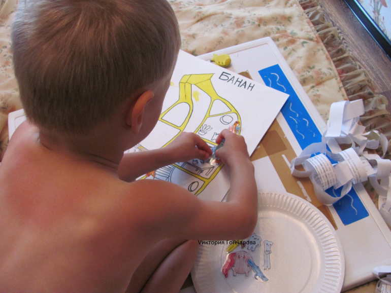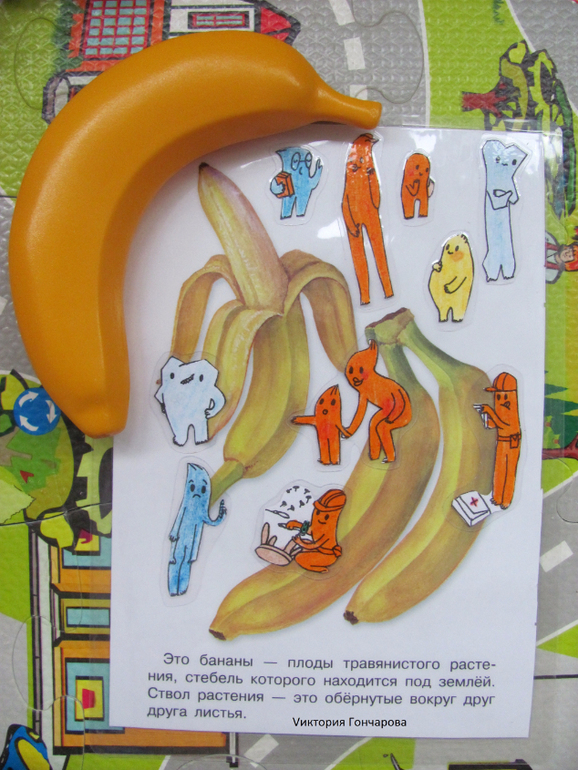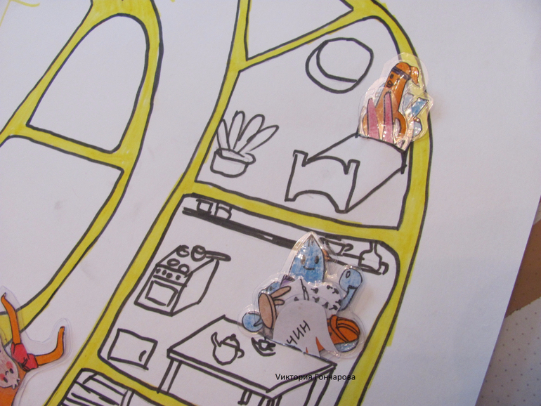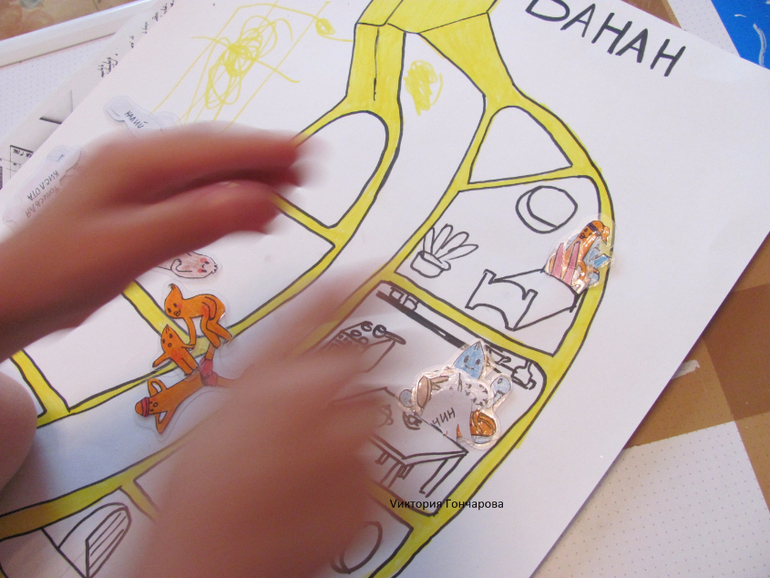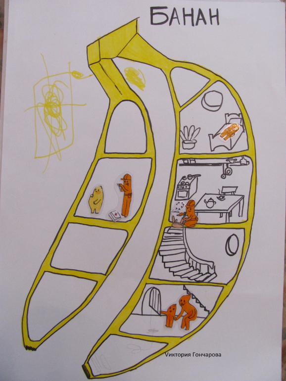 Нарисовали домик - банан. Специально оставила пустые комнаты в банане для дорисовывания ребенком. Можно предложить ребенку самостоятельно нарисовать домики для героев. А можно даже придумать своих героев)