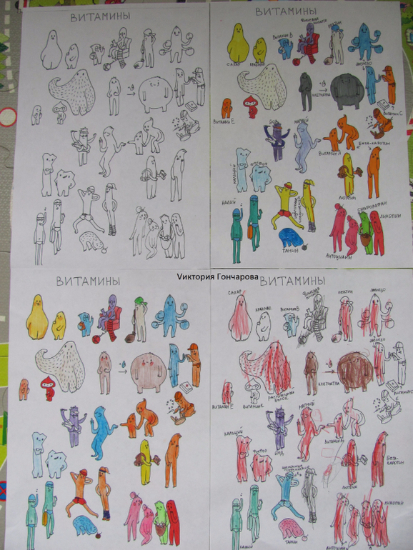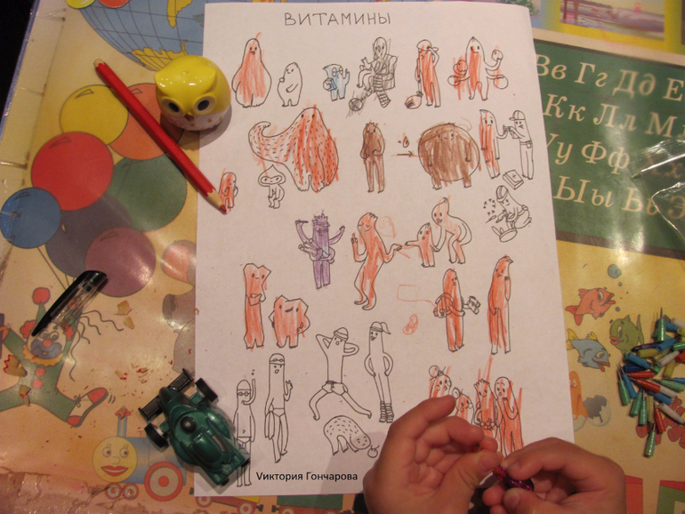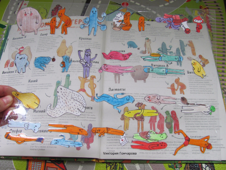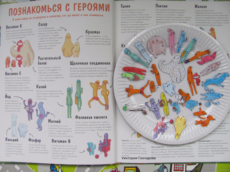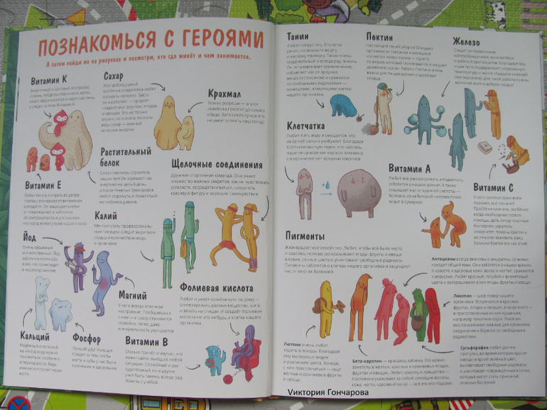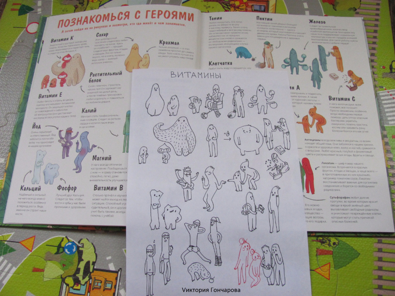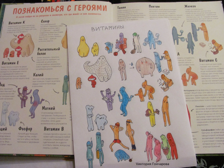 Очень заманчиво что витамины изображены в виде героев, зрительный образ легче и интереснее запоминать, чем обычное перечисление. Вначале нам с ребенком приходилось возвращаться на эту страницу, чтоб посмотреть того или иного героя, но со временем, даже ребенок стал их запоминать, конечно не всех, пока только самых любимых.