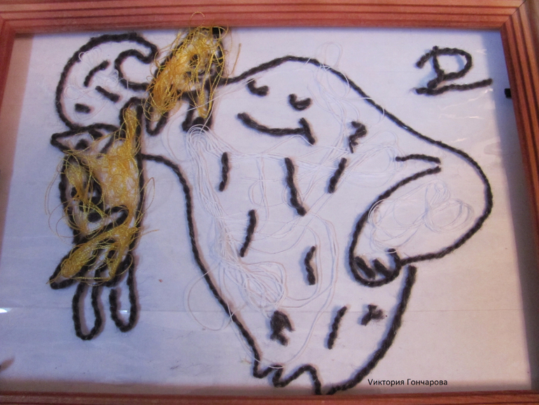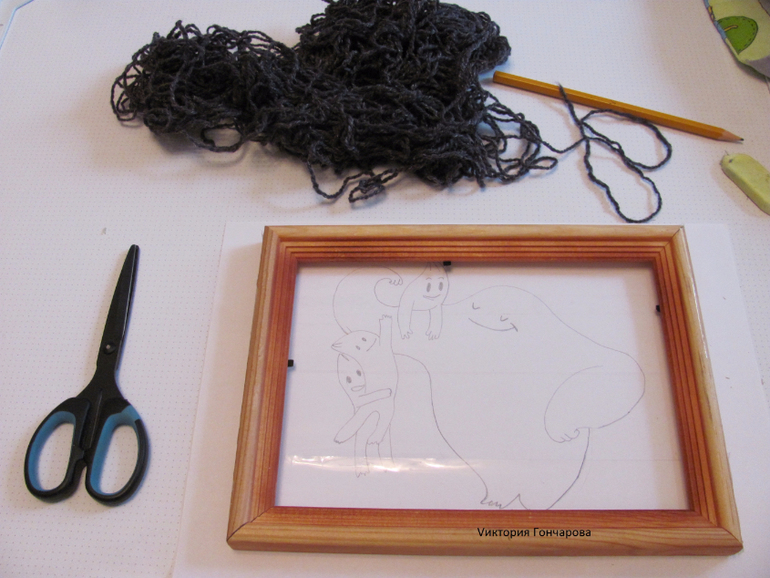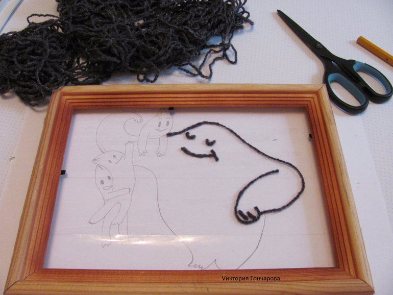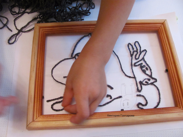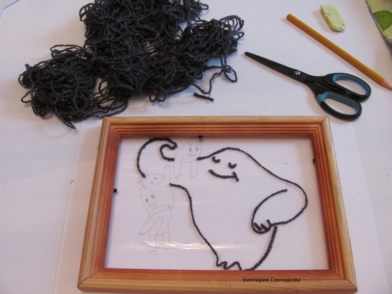 Затем берем нитку и накладываем ее по контуру. Мы отрезали нитку разной длины.