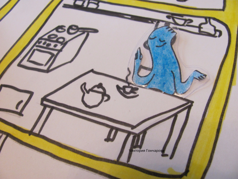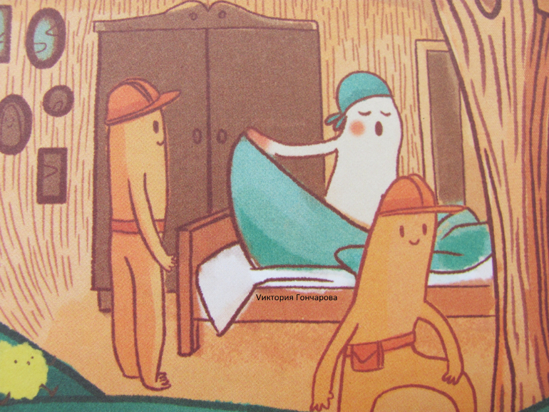 Но, т.к героев много а кровать и стол один - пришлось всех туда вмещать))