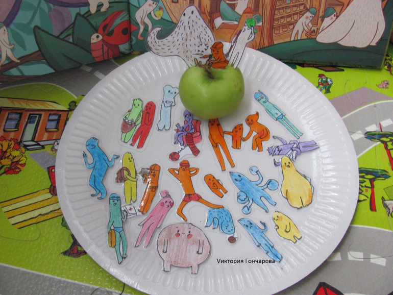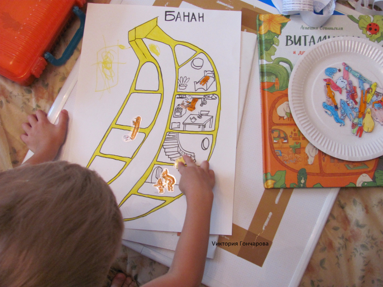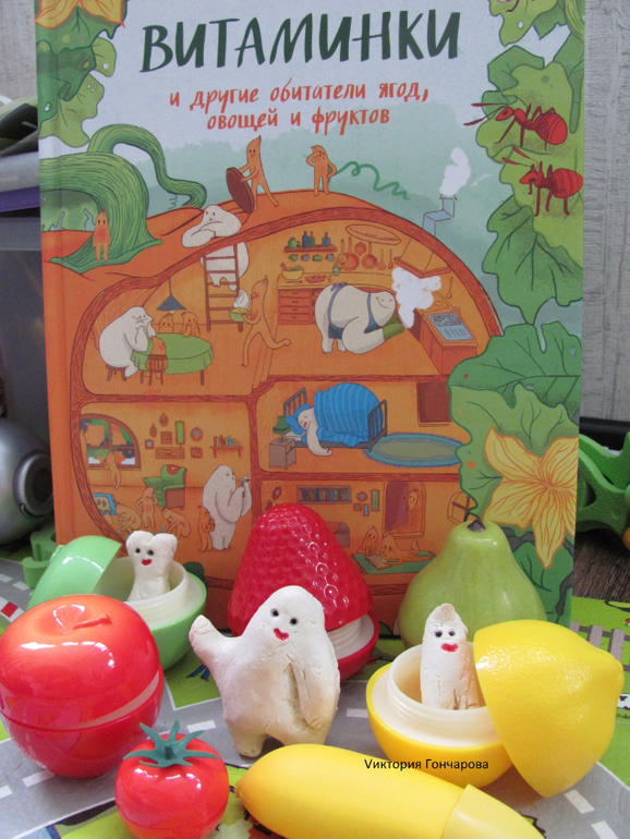 Следующие игры с использованием фруктов и овощей. Раскручивали тюбик и заселяли нужных витаминов. А также вспоминали где ягода, а где фрукт/овощ.