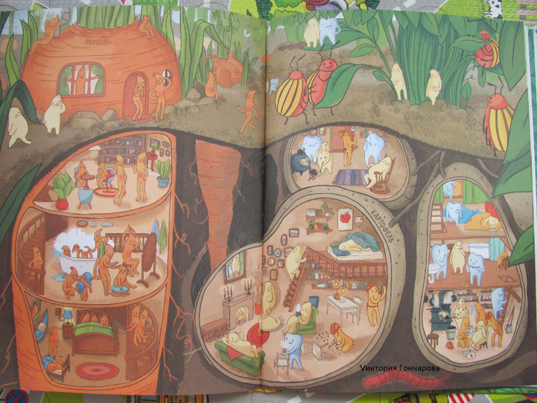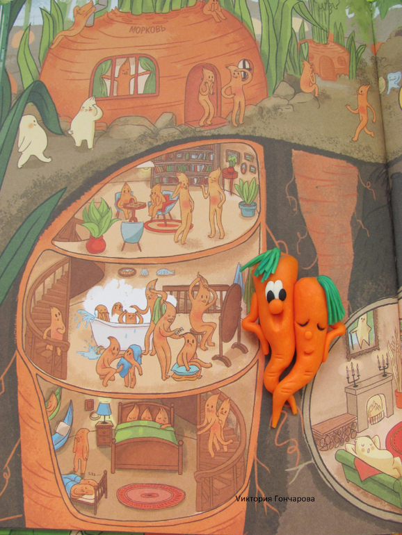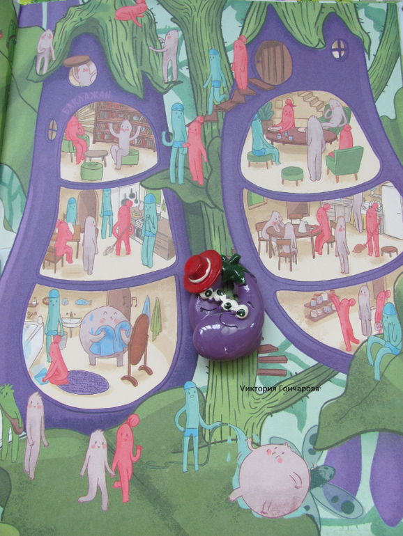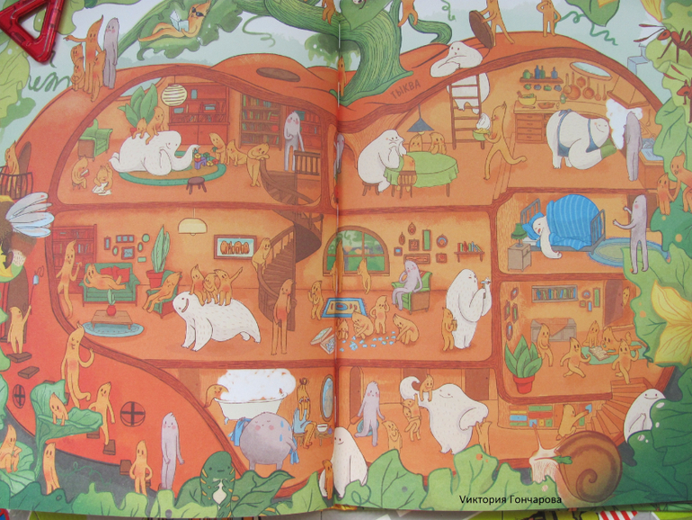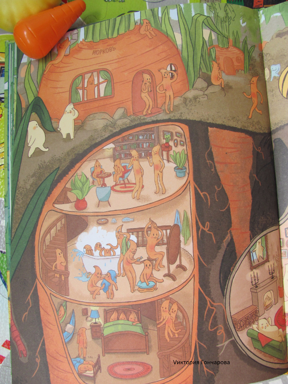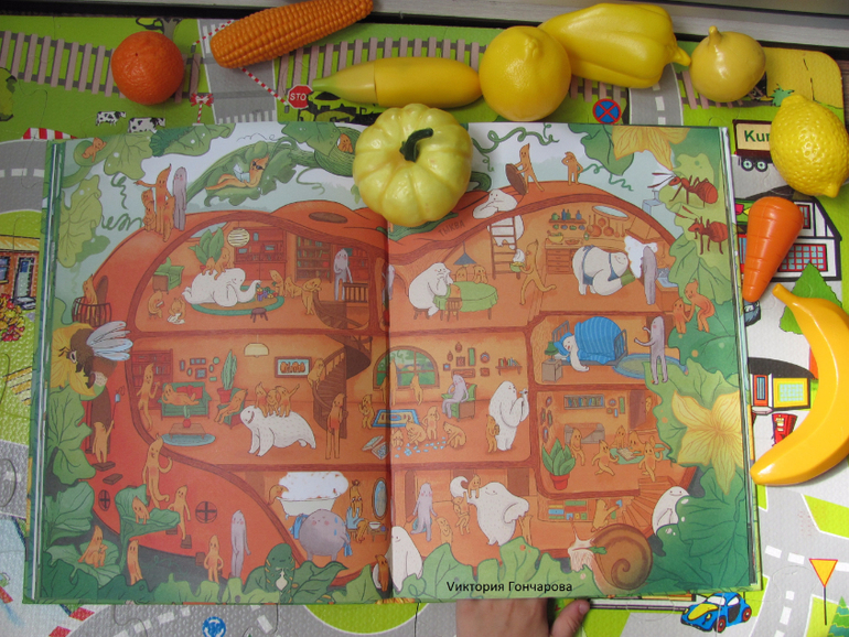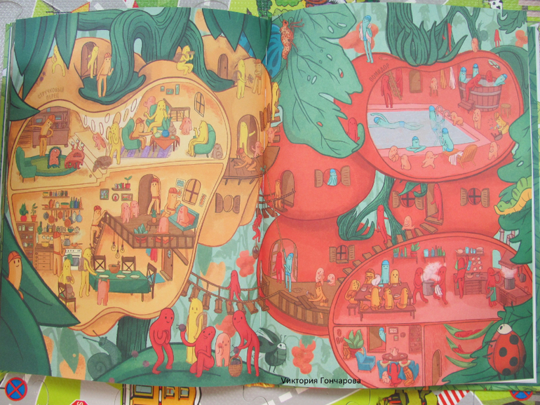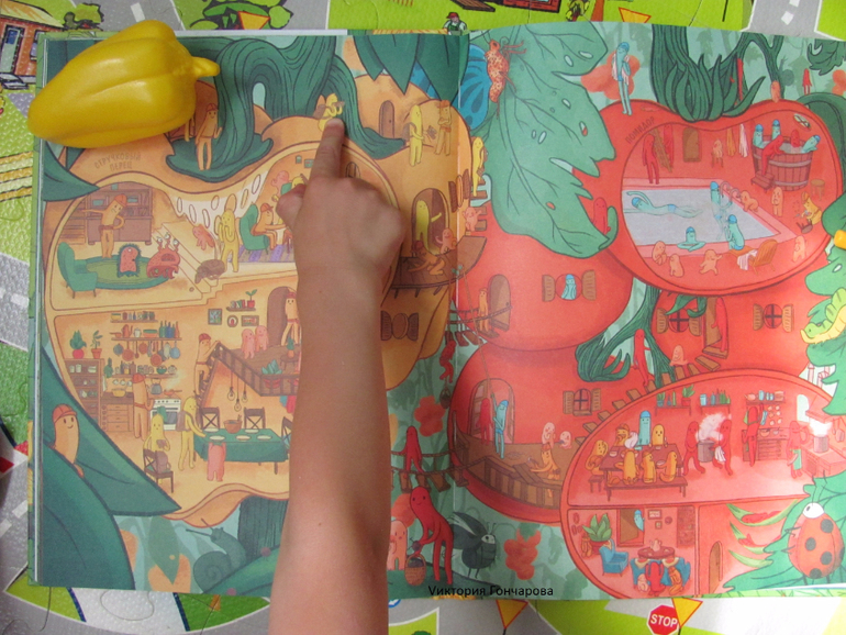 Вот такие фрукты и овощи вы встретите на страницах книги - слива, яблоко,персик, груша, малина, стручковая фасоль, клубника, черника, цветная капуста, баклажан,брокколи, огурец, кабачок, свекла,тыква, капуста, морковь,картофель,сельдерей, петрушка, стручковый перец (наверное все-таки не стручковый, а обычный), помидор.