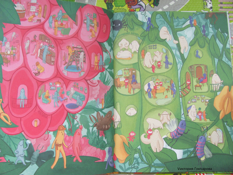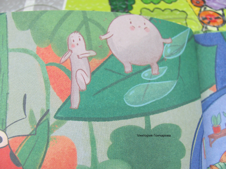 И что еще очень понравилось - это отлично прорисованный фон, который рассказывает как растут фрукты/овощи. Какой фрукт растет на ветке, а какой овощ в земле? И конечно наличие соответствующей "массовки" - разные жучки, паучки, червяки, бабочки, гусеницы и прочие насекомые. Вот например на первом развороте Пектин и Магний отлично справляются с гусеницей.