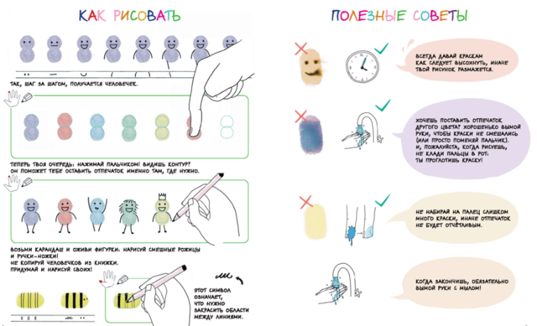 Благодаря книге ребенок не только научится рисовать человечков, зверей и волшебных созданий, но и сможет придумывать свои истории с помощью сюжетных картин, в которые надо вписать персонажей. Потренировавшись на отпечатках, он сможет превратить в забавный рисунок любую кляксу или пятнышко.