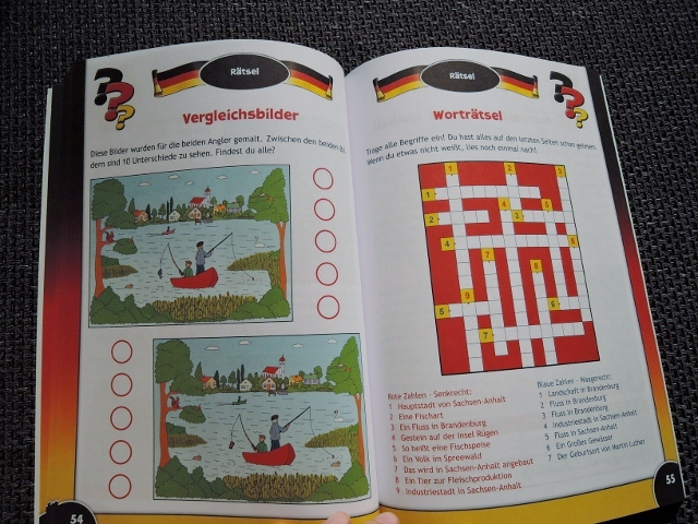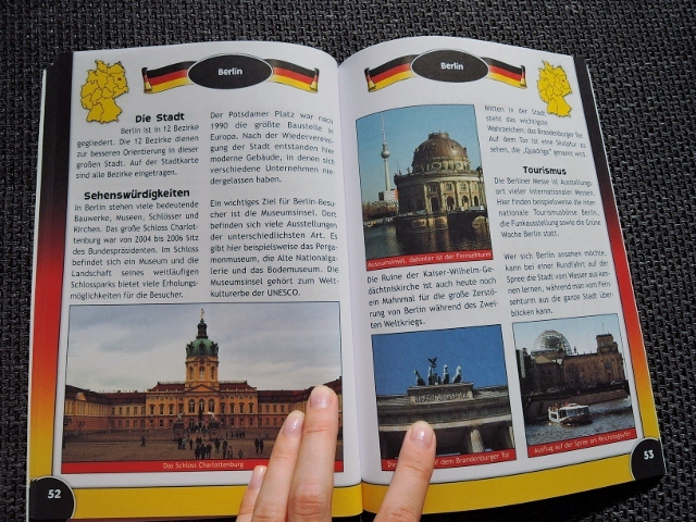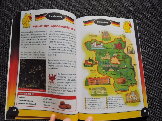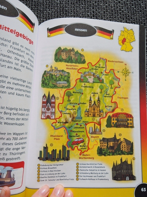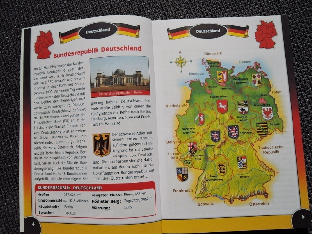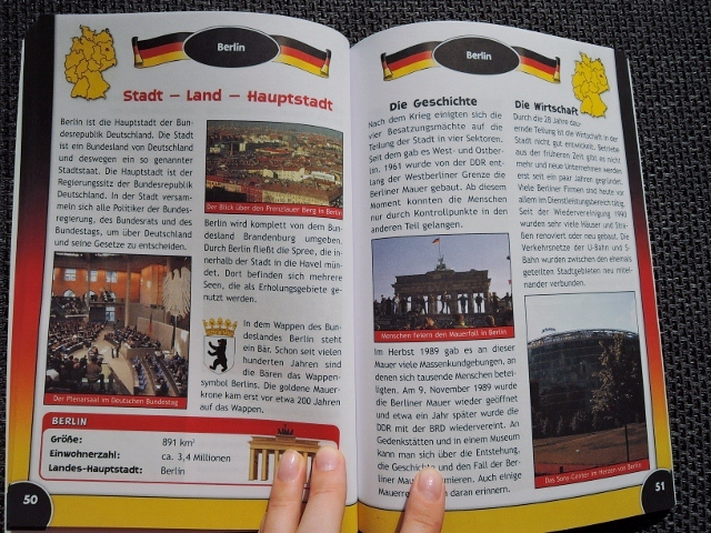 Книжка о Германии для уже не маленьких детей. Описана каждая Земля с картой, достопримечательностями и важными историческими событиями. Есть загадки и задани по пройденному материалу. Купила себе, так как язык простой и легко понятный.