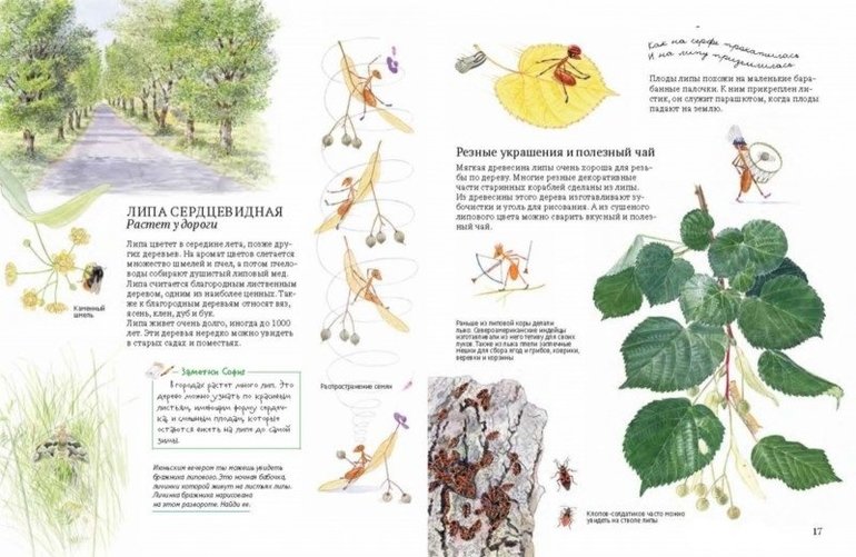 Помимо этого, на каждой странице вы увидите заметки Софи и предложенные ею задания, например на странице про липу нужно найти личинку бражника.
