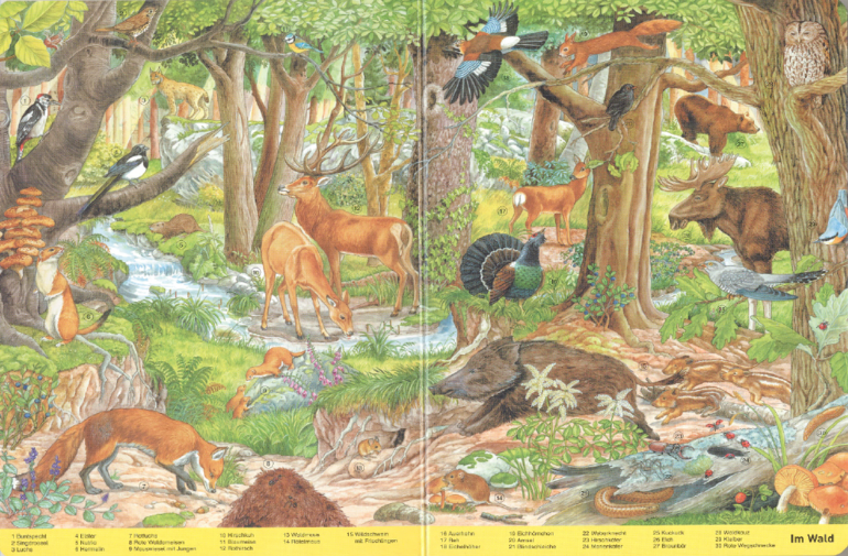 Это виммельбух, или книга на рассматривание, известного автора Anne Suess. Купила книгу в комплекте из трех виммельбухов на немецком сайте mytoys. У нас мини вариант - небольшой формат А5 - удобно брать в дорогу или на прогулку. Книга полностью посвящена животным, в том числе живущим в лесу.