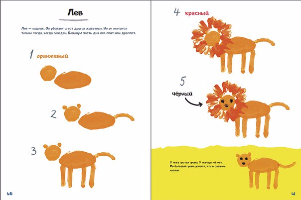 Из нашей книги ребенок узнает, как "с нуля" нарисовать бабочку, дерево, страуса и даже льва, используя только собственные ладошки и пальчики!