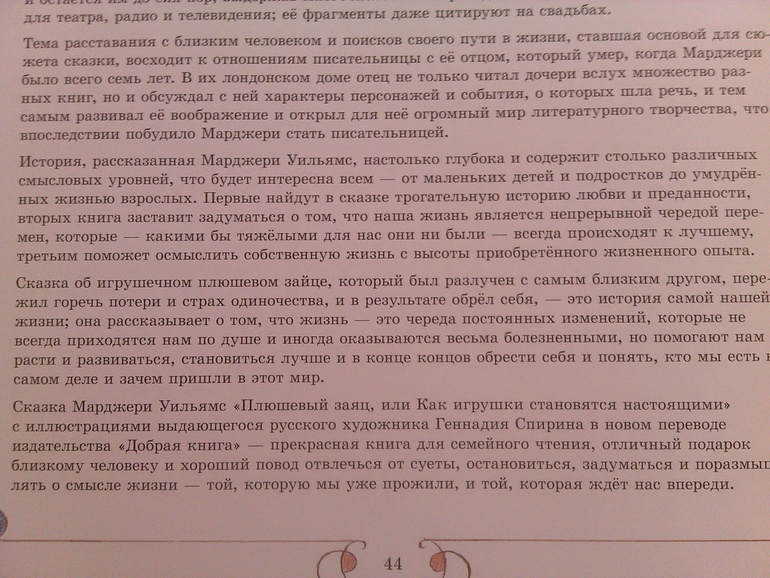 Понравилось. Душевная, добрая, немного грустная история про игрушечного зайца, любимца маленького мальчика. В конце книги статья об этой сказке.