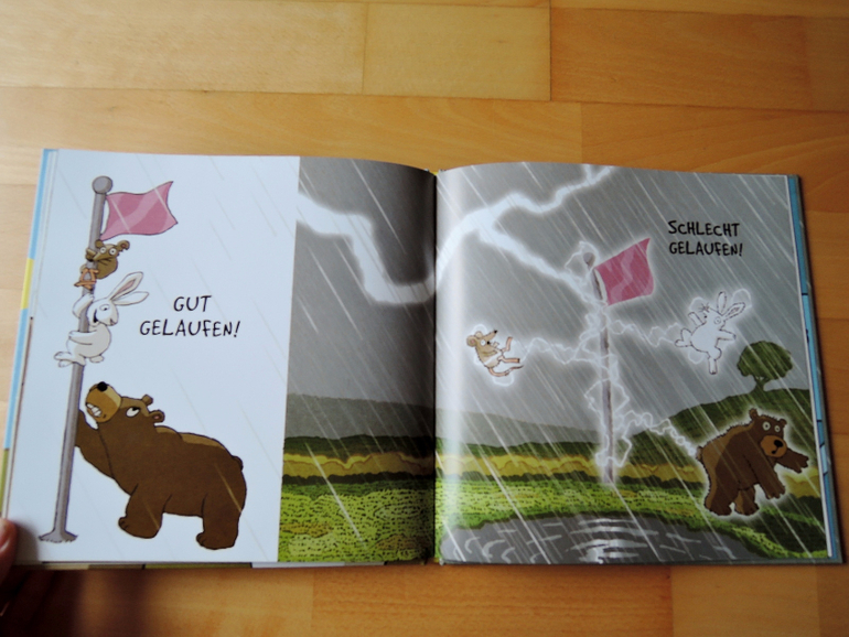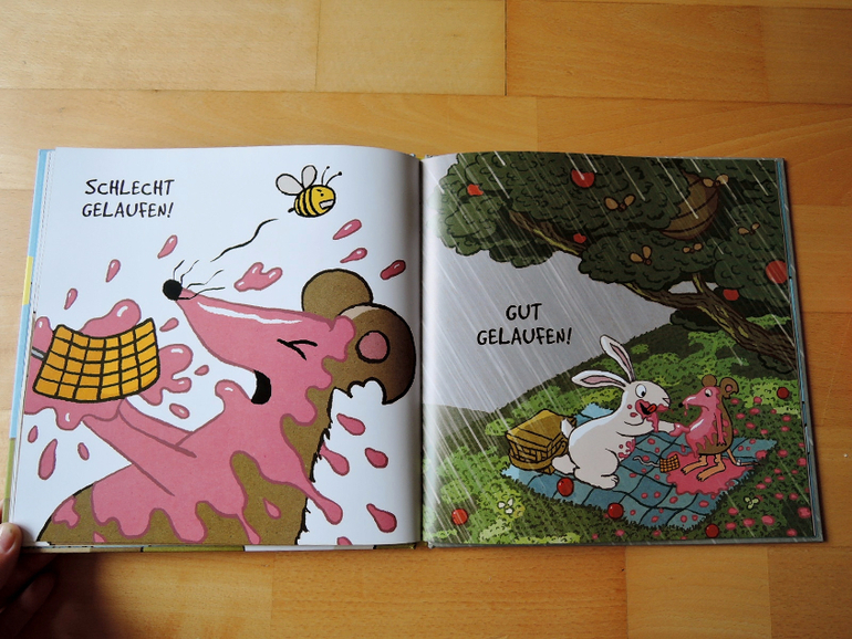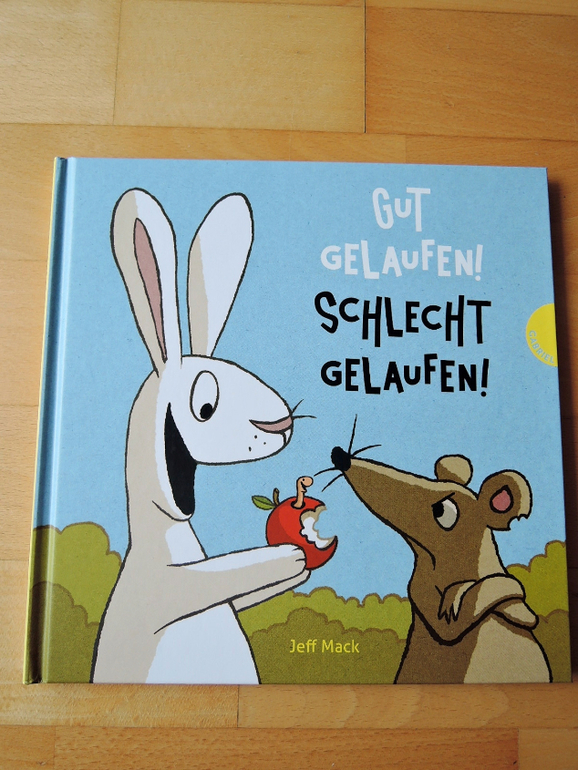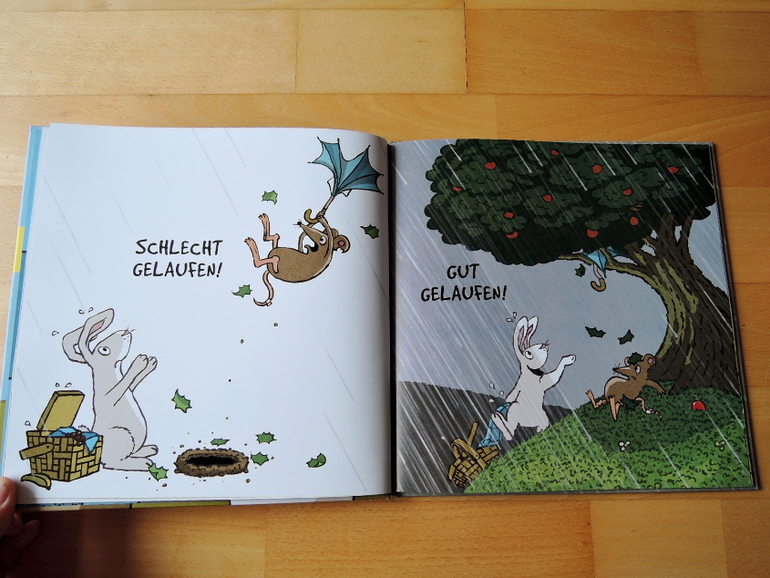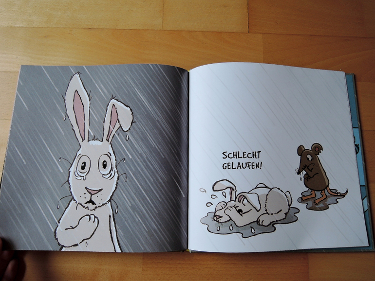 История о том, что кролик оптимист, а мышонок пессимист, и на этом построена вся книга. В конце мышонок выходит из себя, кролик плачет. А потом выходит солнце из-за туч, и мышонок успокаивает кролика.