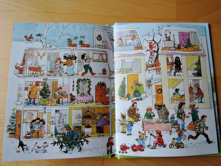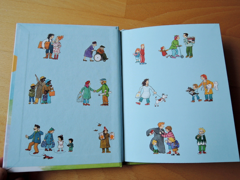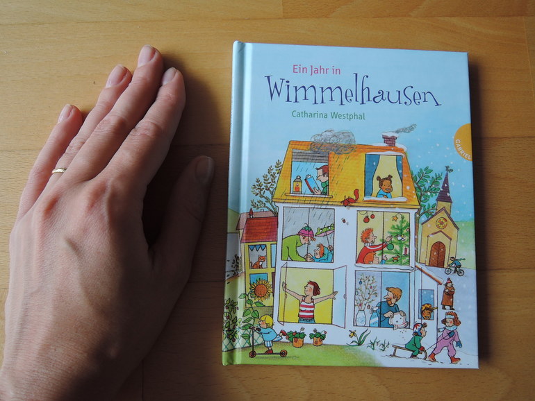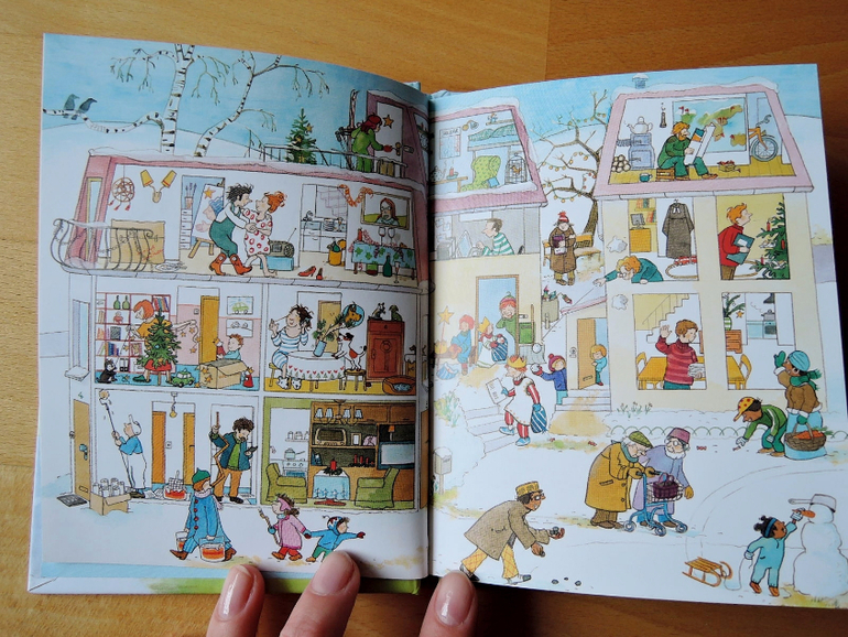 Вот так нежданно-негаданно появился у меня первый виммельбух. Размер я не посмотрела, поэтому удивлена, какая она маленькая)) Но иллюстрации мне очень нравятся, такие светлые и радостные.