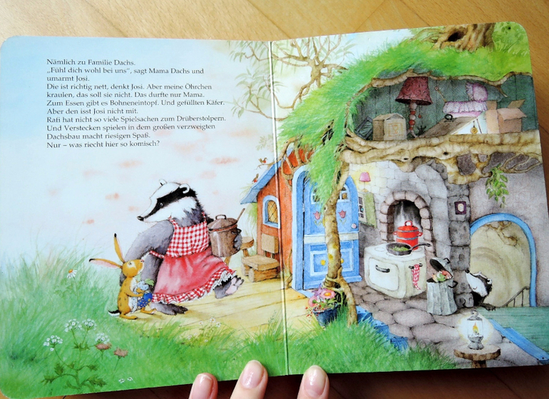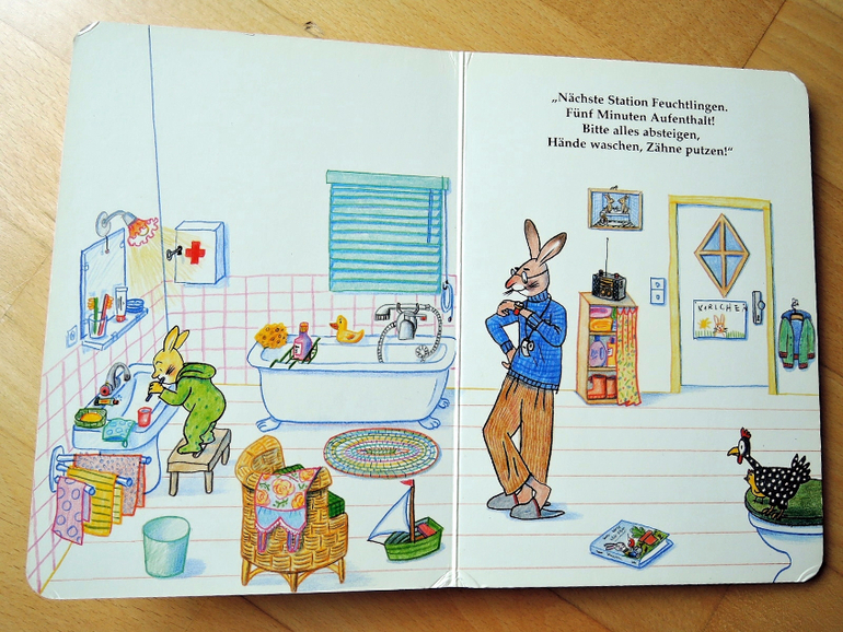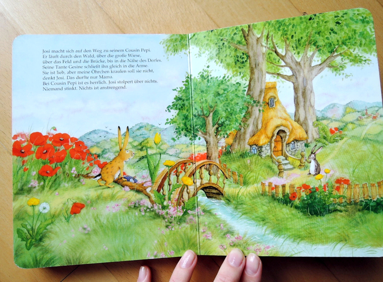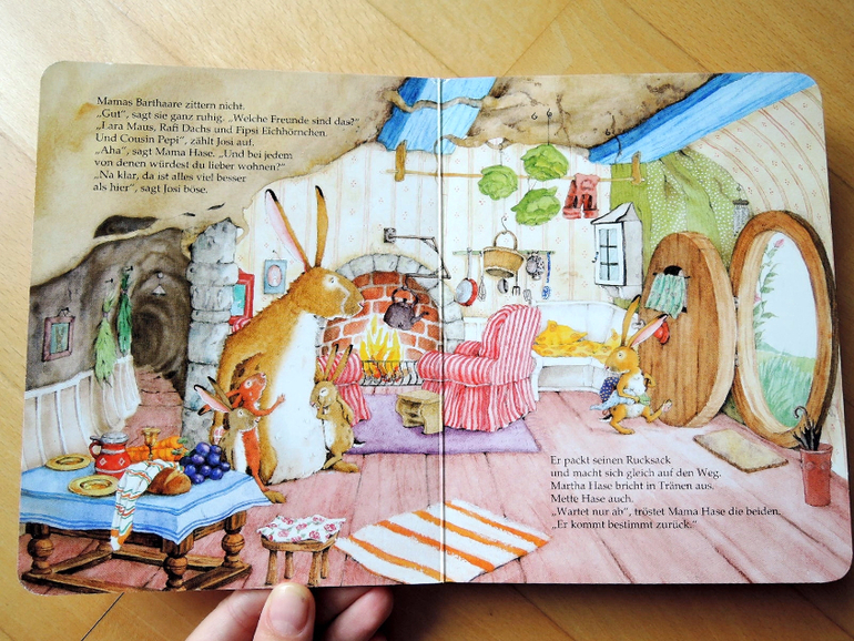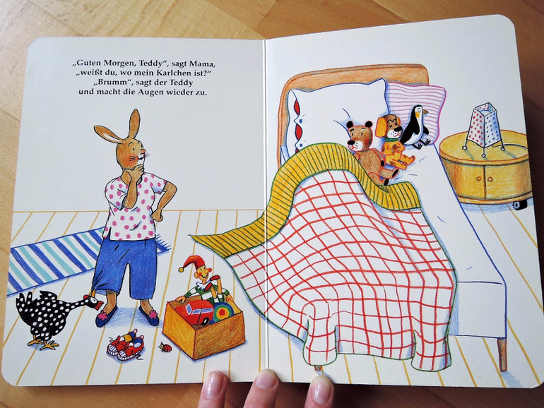 Зайцы видимо считаются особо подходящими персонажами для детских книг) Вот у меня уже их целых 3 (нет, даже четыре, я просто раньше про одну уже писала, которая "Знаешь, как я тебя люблю"). И все довольно известные и любимые детьми. Тут на немецком, но они уже давно переведены на русский, поэтому даю русские названия. Под катом больше картинок и содержание.