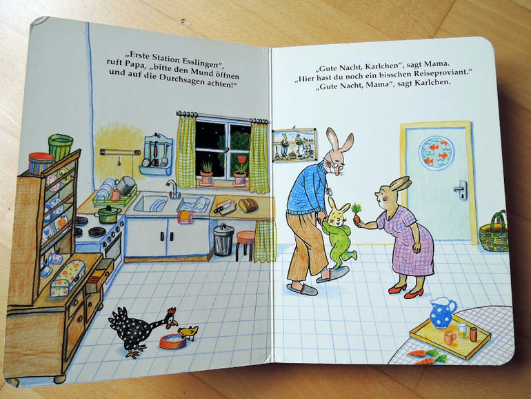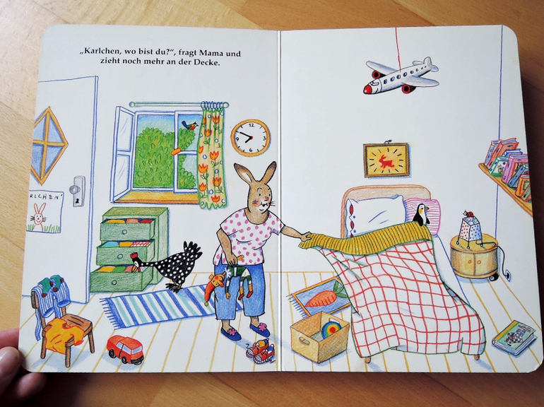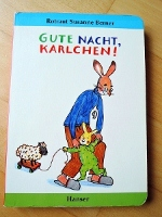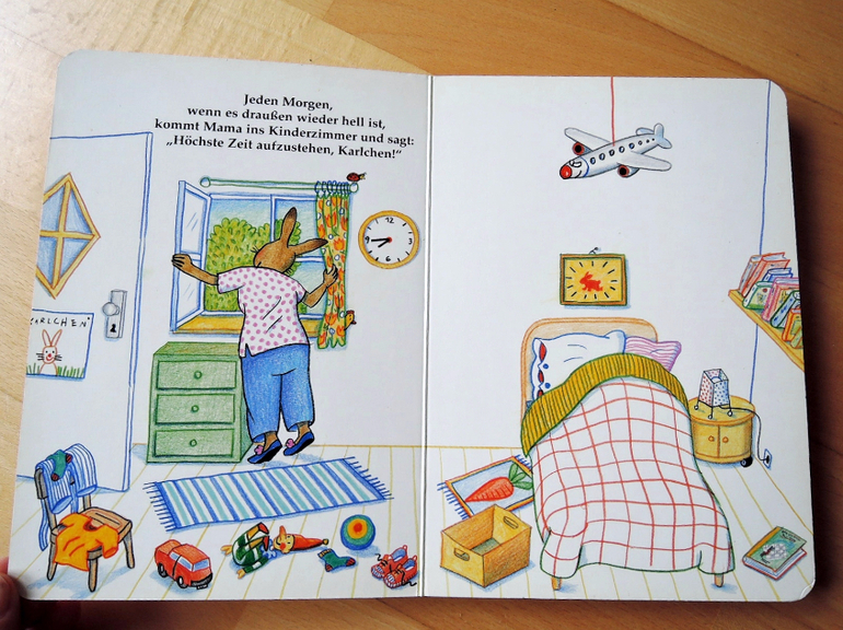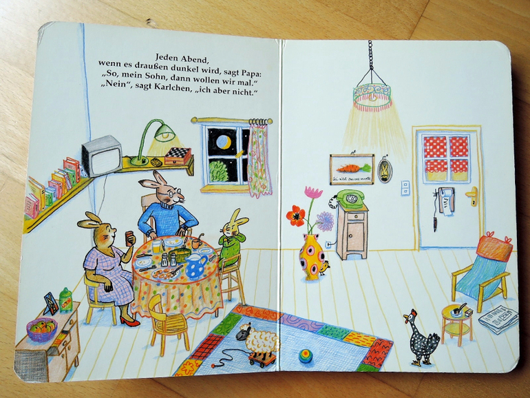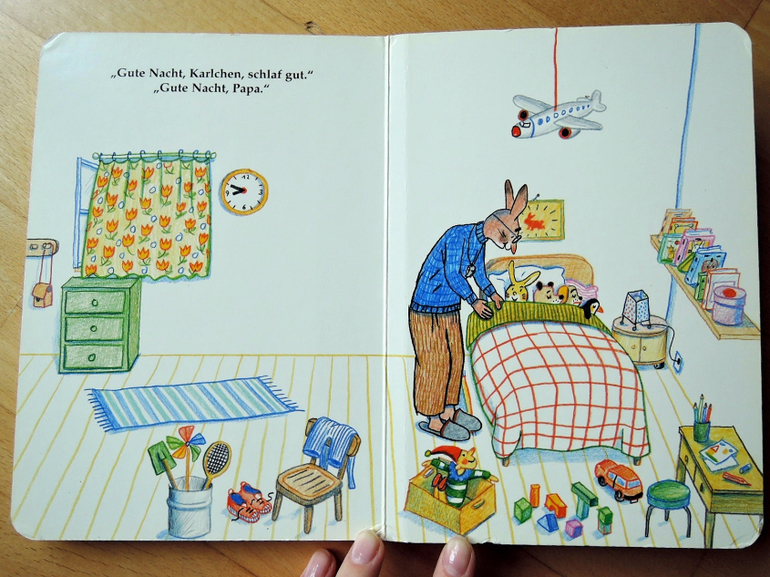 Карлхена я сначала не думала покупать, так как мне не очень нравятся иллюстрации. Но сами истории очень трогательные, поэтому я взяла про то, как папа укладывает кролика Карлхена каждый вечер спать, с разными уловками, потому как Карлхен как многие малыши совсем не хочет идти в постель. И про маму, которая каждое утро будит Карлхена.