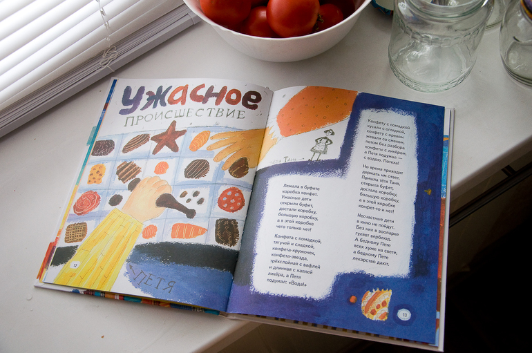 Вот не нравятся мне многие сборники стихов том, что порой иллюстрированы они все кучей. А тут к каждому короткому стиху - целая страница ярких рисунков. И что обсудить есть, о чем поговорить.